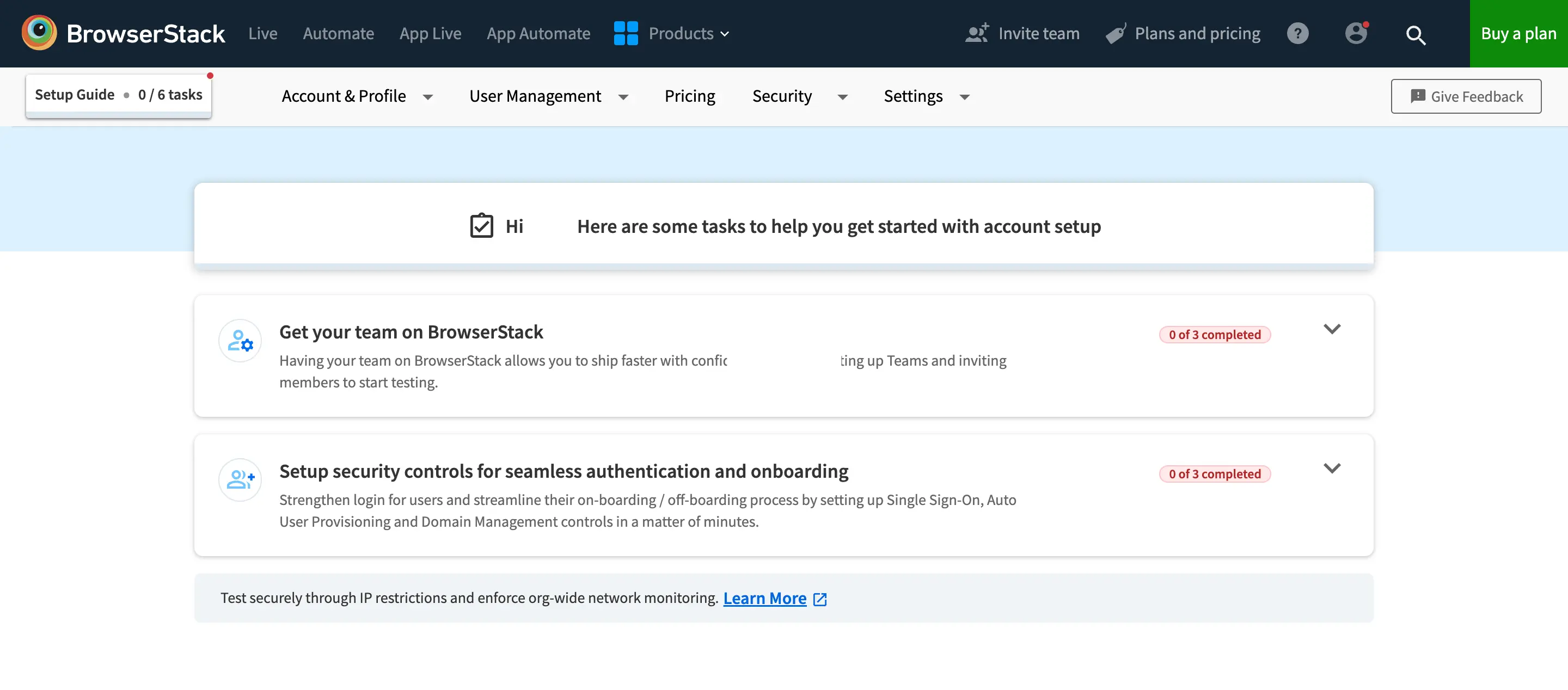 BrowserStack Enterprise offers a user-friendly interface and a straightforward setup guide. On the BrowserStack dashboard, click the User Profile icon and click Account & Profile. Now, click the Setup Guide button at the top left to begin.