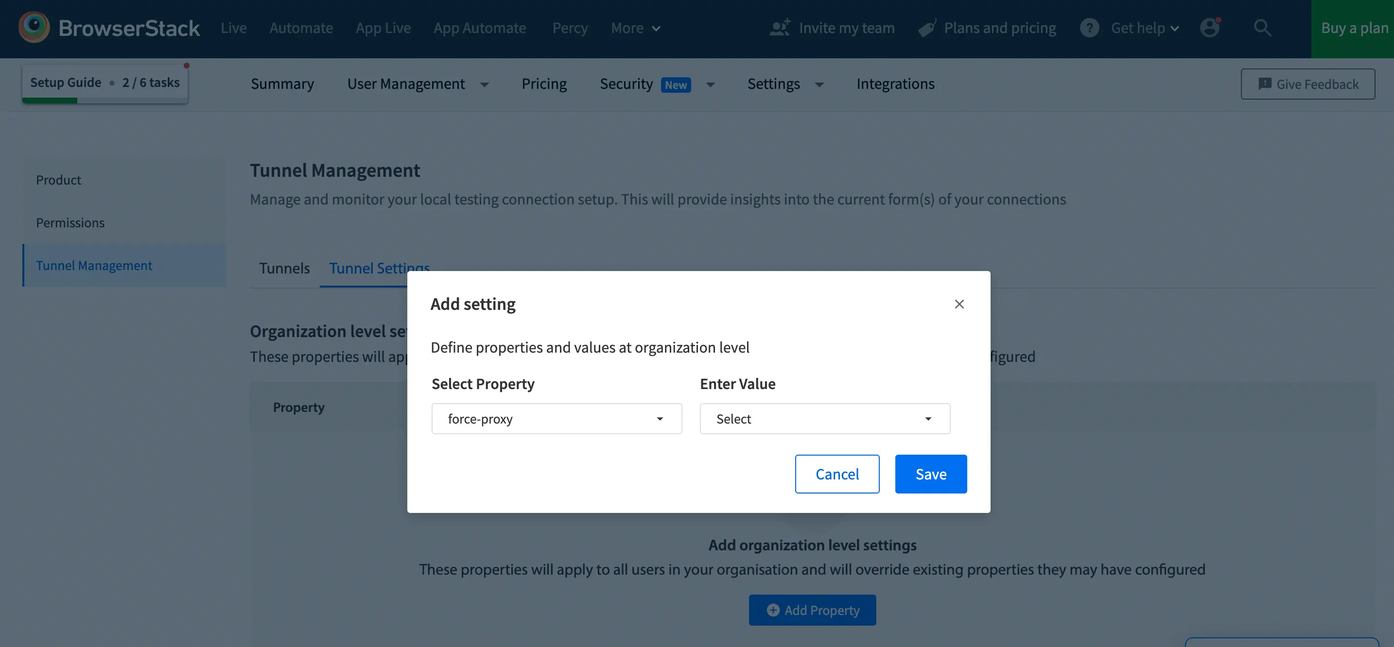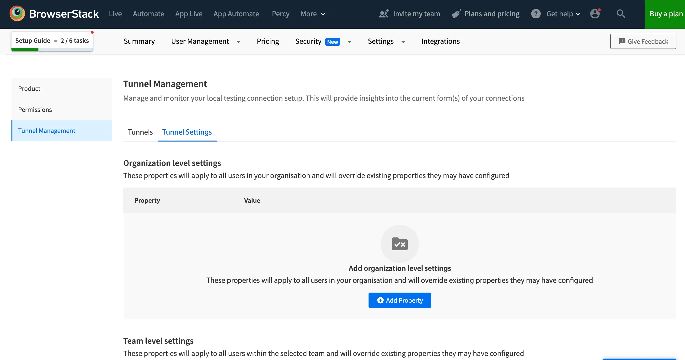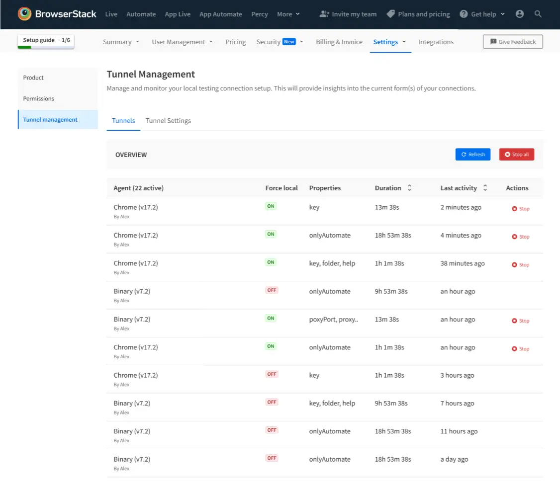 - BrowserStack will enable the Centralized local testing feature for your account (Contact support for the same). Once enabled, all Local testing traffic will be routed through the central connection and prevent other users within your account from launching Local testing connections with their own API keys.