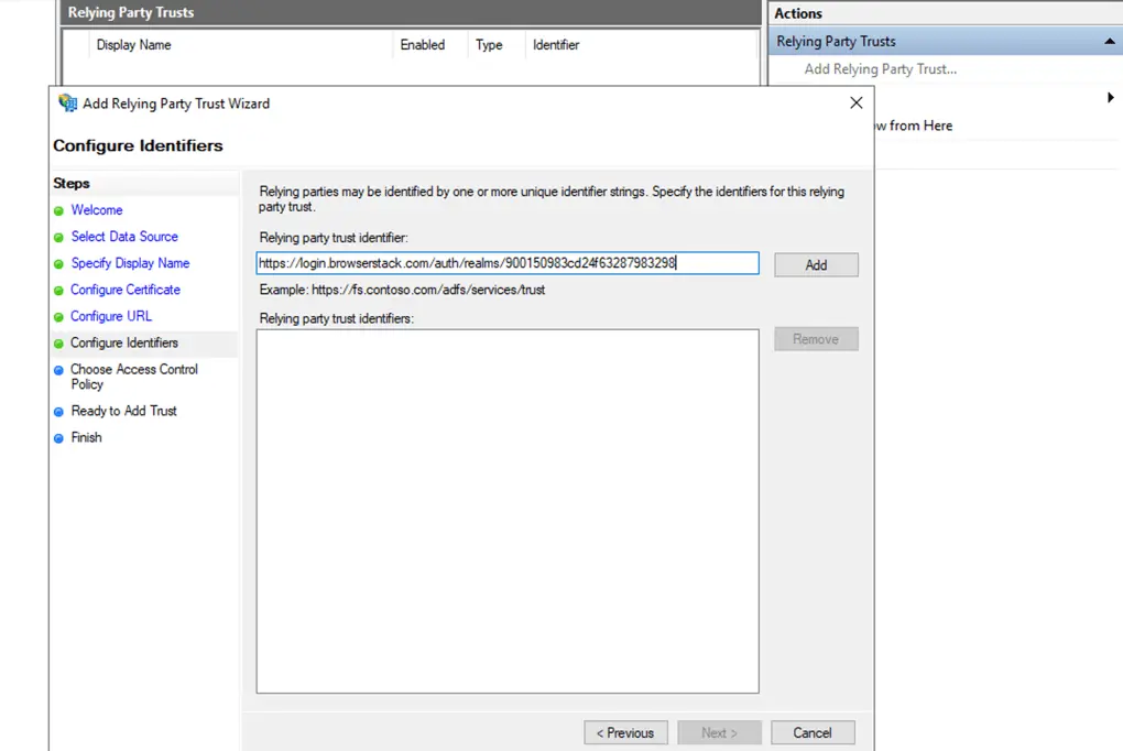 - On Configure Identifier, enter the copied Entity ID in Relying party trust Identifier. Click next.