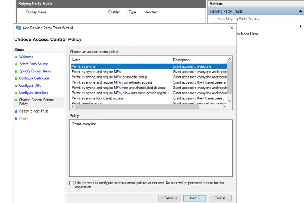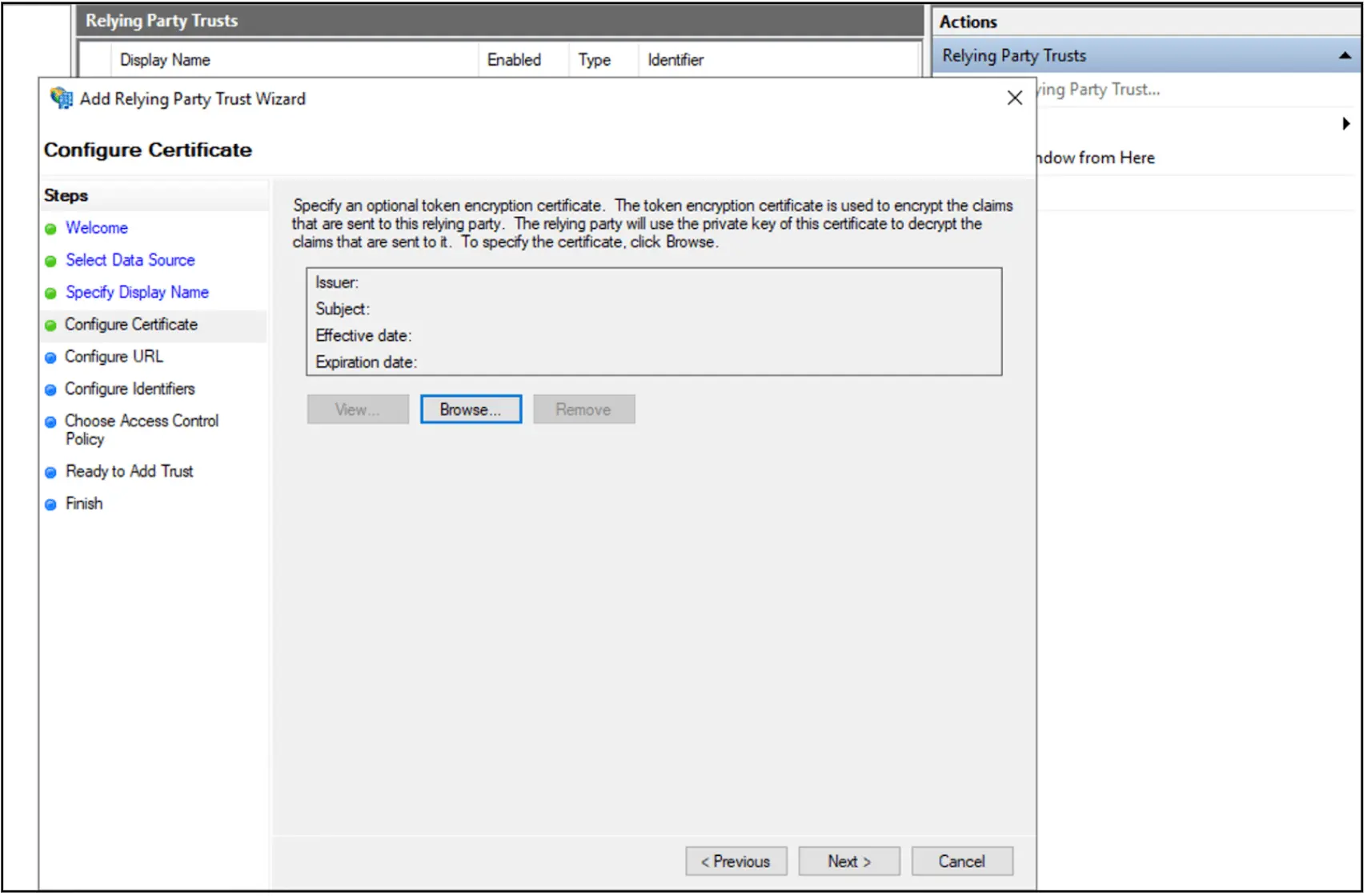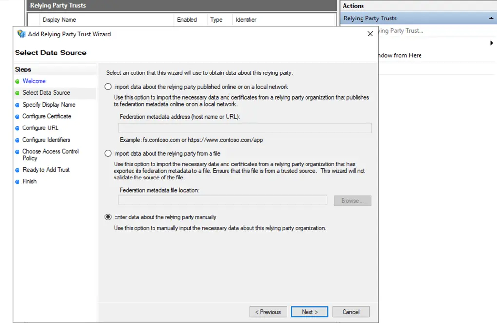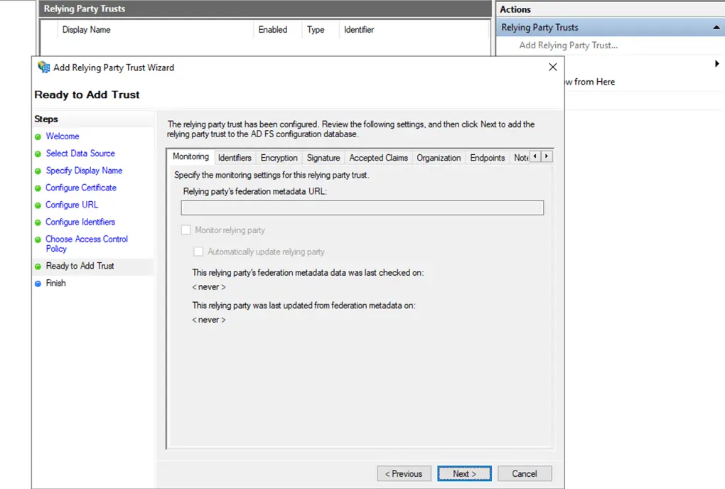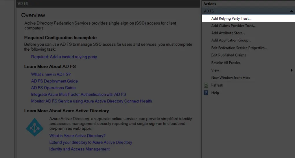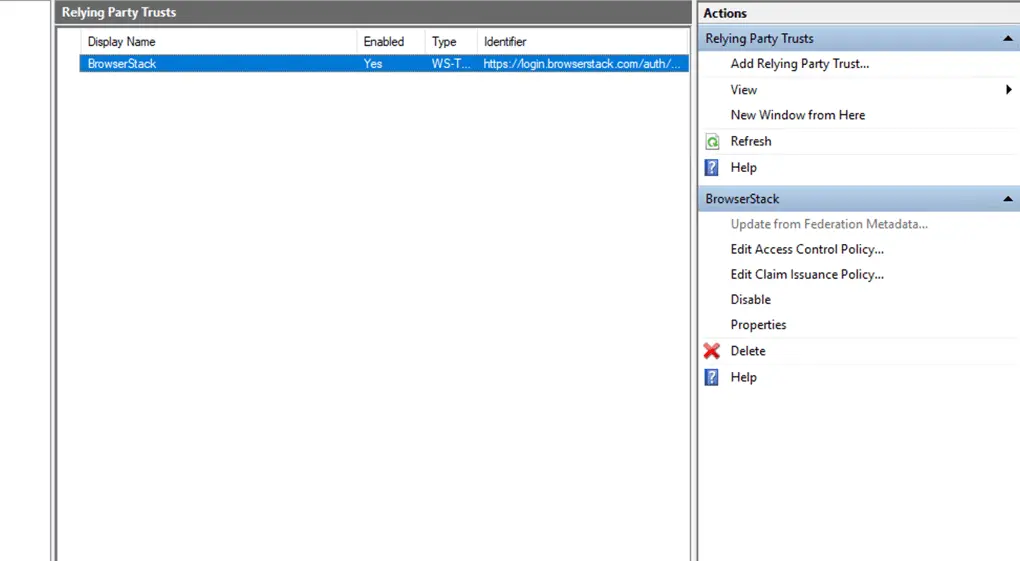 - Choose your added Relying Party Trust (list will contain the name you gave to the connector) and double click