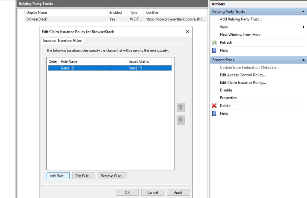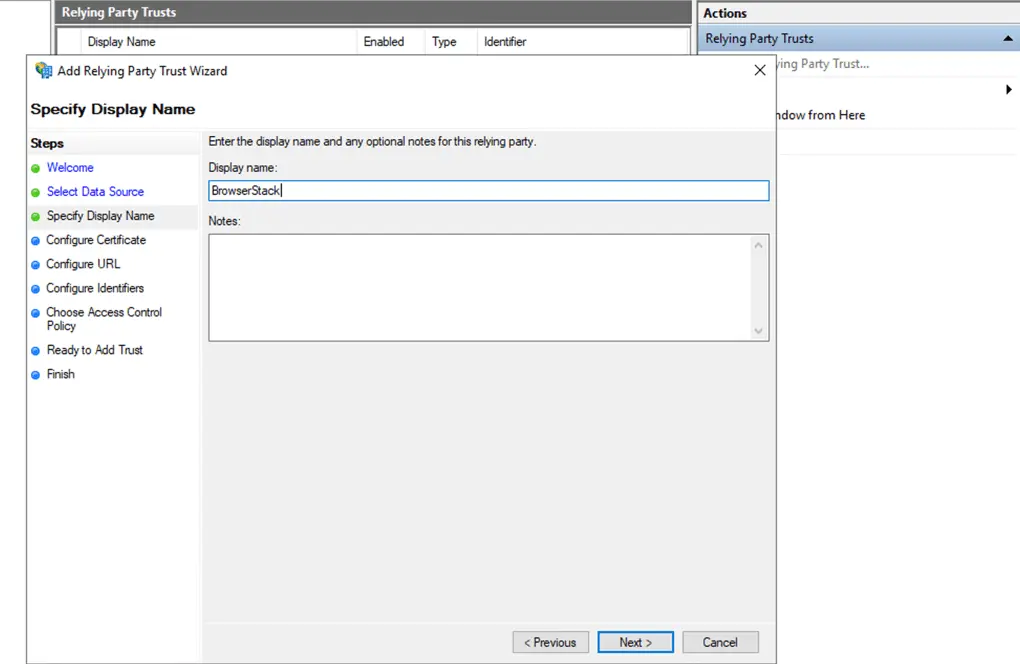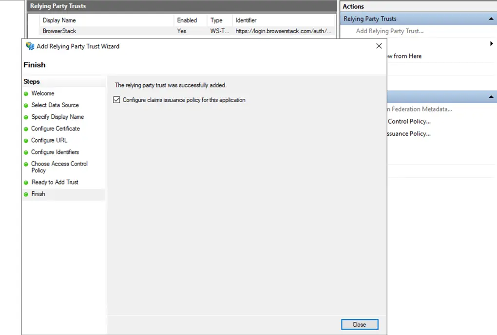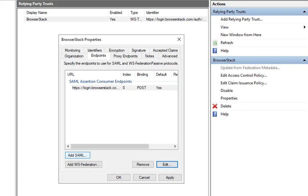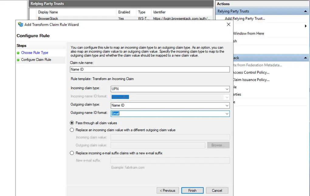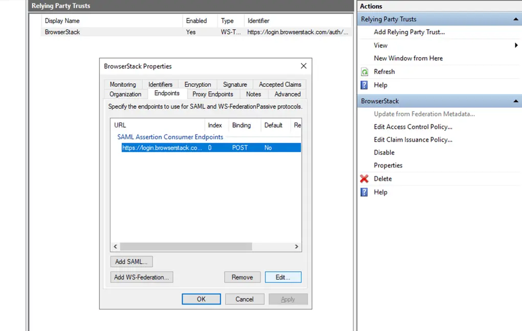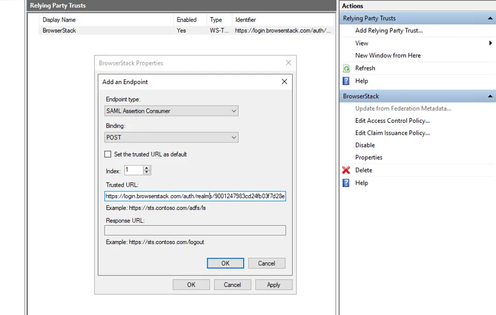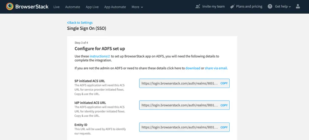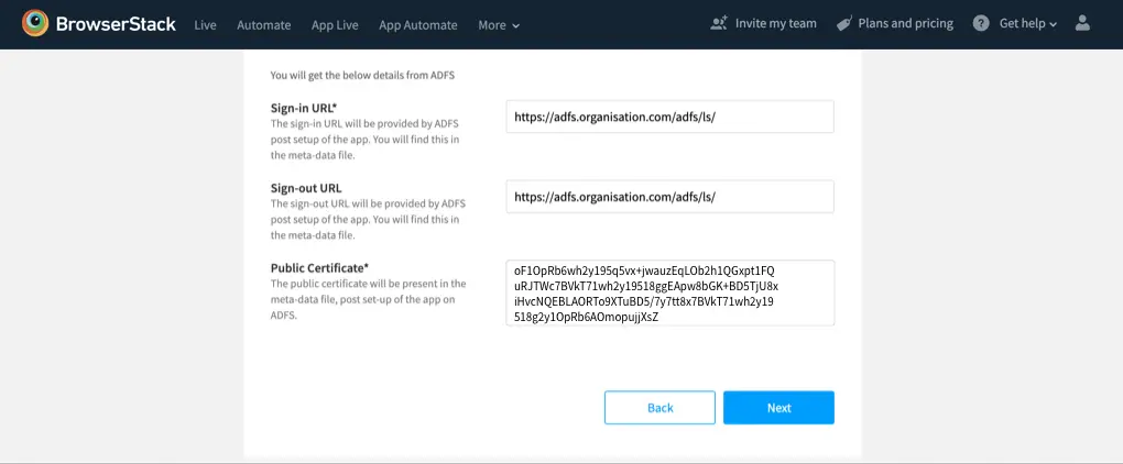 - Paste these values in the corresponding fields on ADFS configuration screen on BrowserStack