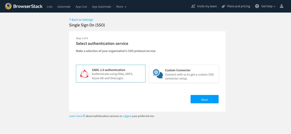 On the next screen, you will be shown all the Authentication services that BrowserStack supports, select SAML 2.0 and click Next.