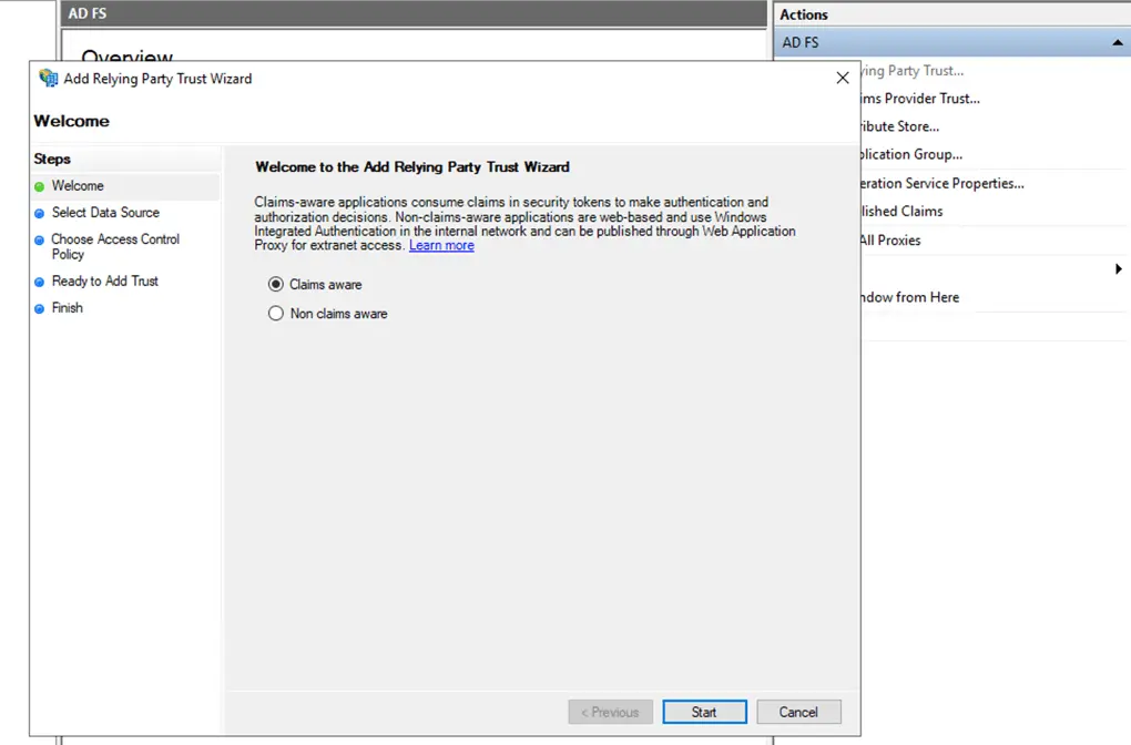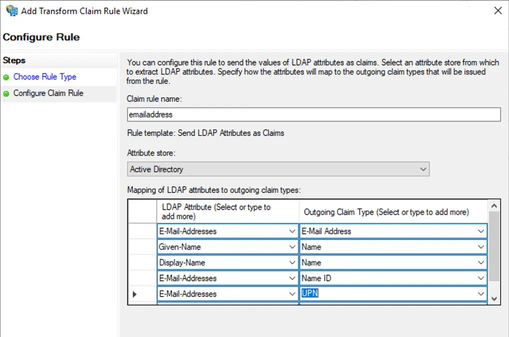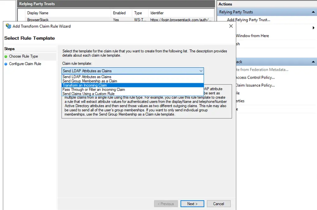 - Click on Add Rule and choose the Claim rule template as “Transform an Incoming Claim” and click next.