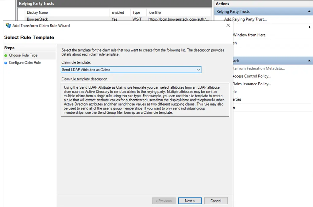- Add another Rule. Select Claim rule template as Send LDAP Attributes as Claim and click next.