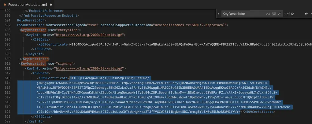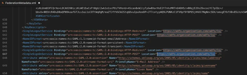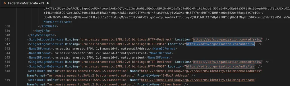 - Go to YourADFSmachineURL/FederationMetadata/2007-06/FederationMetadata.xml