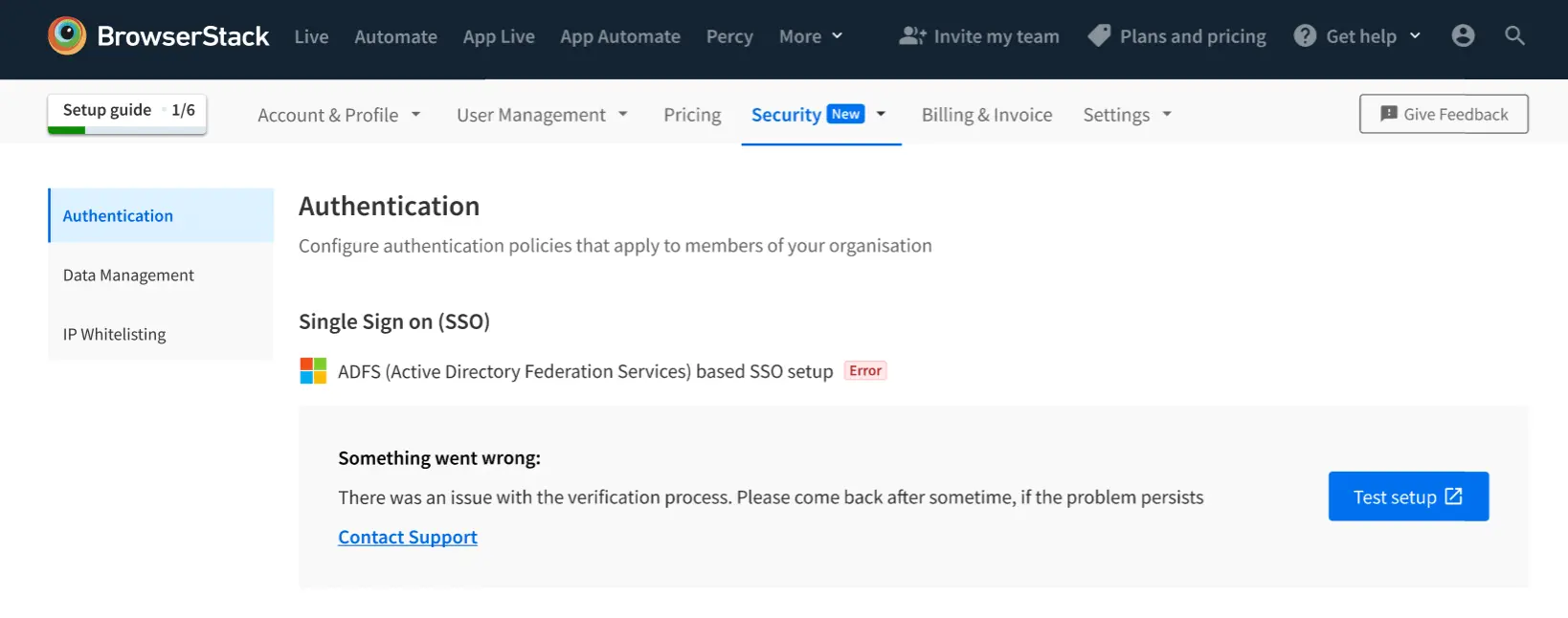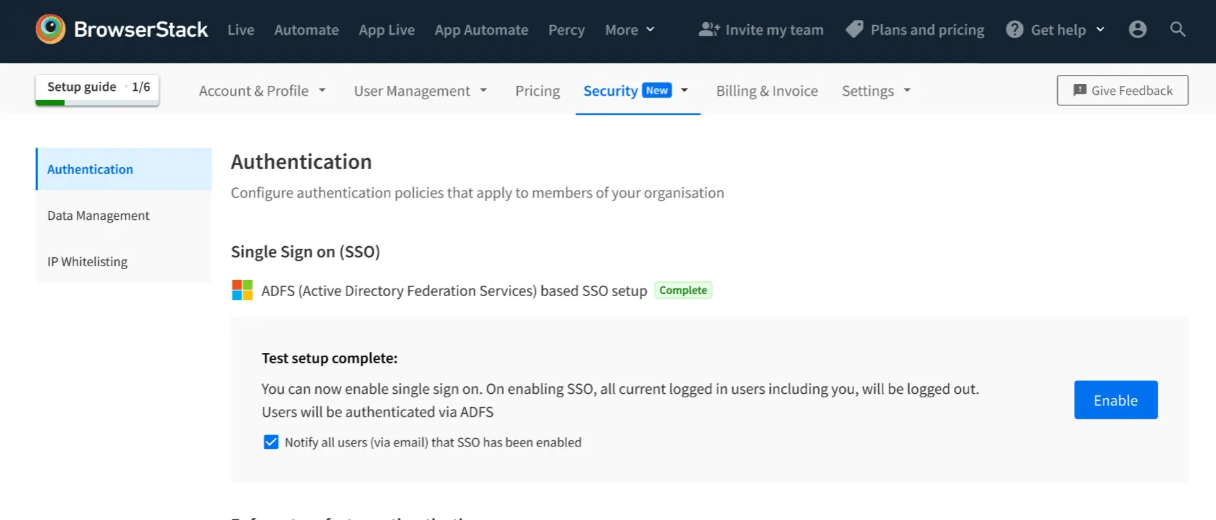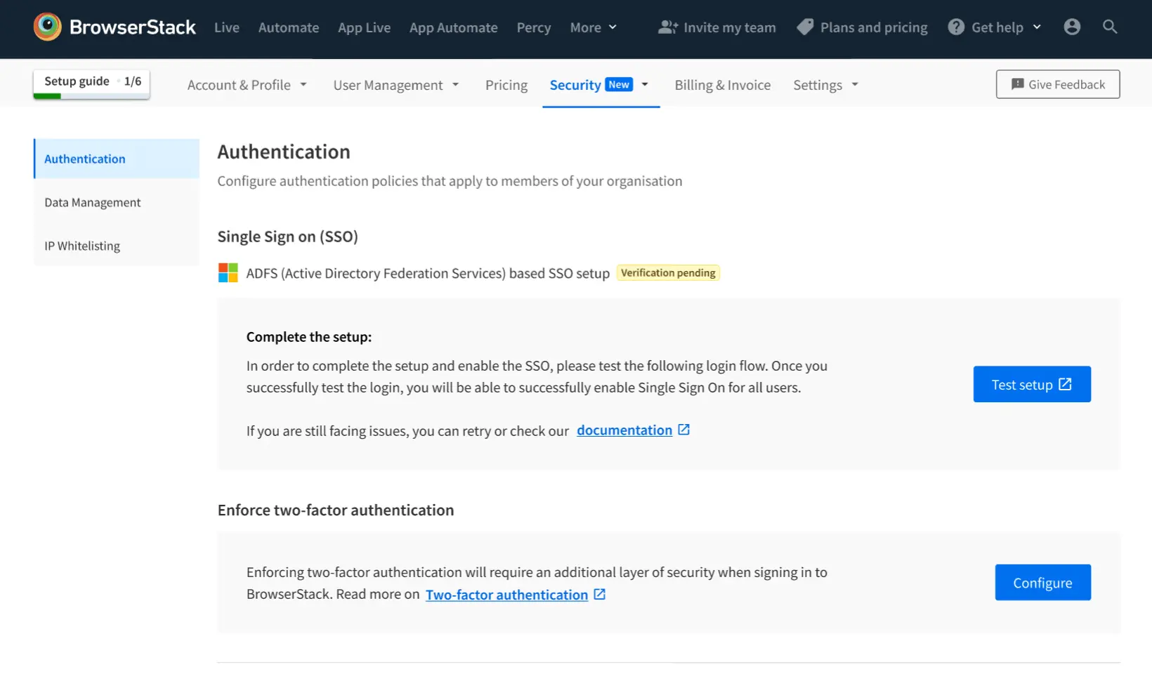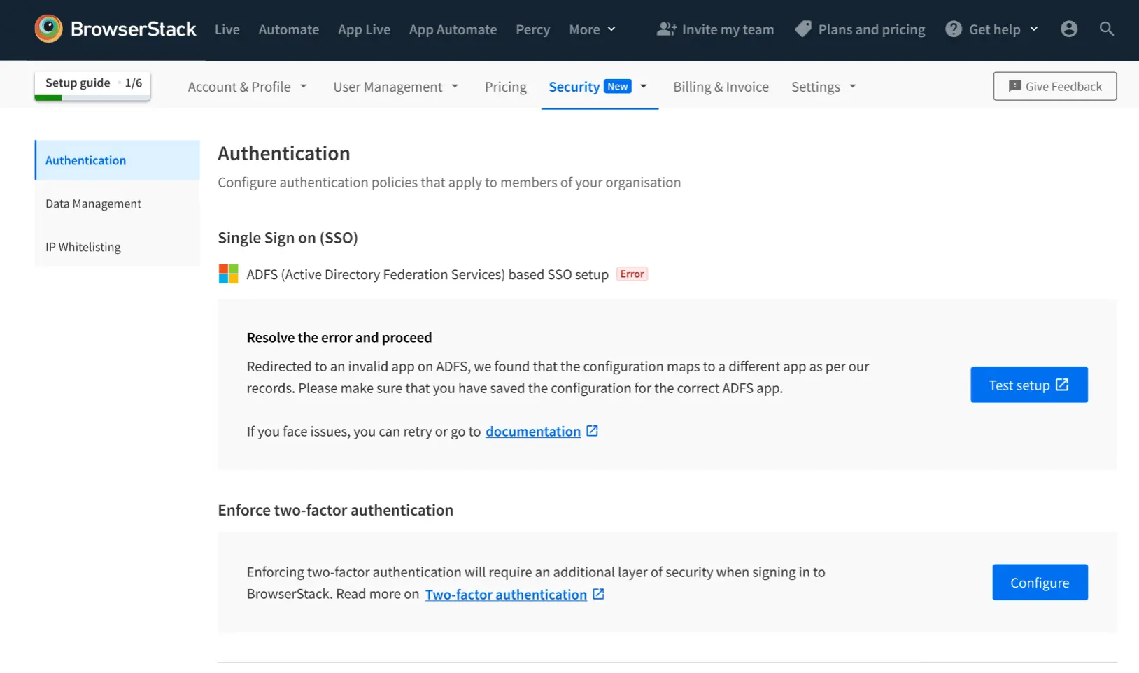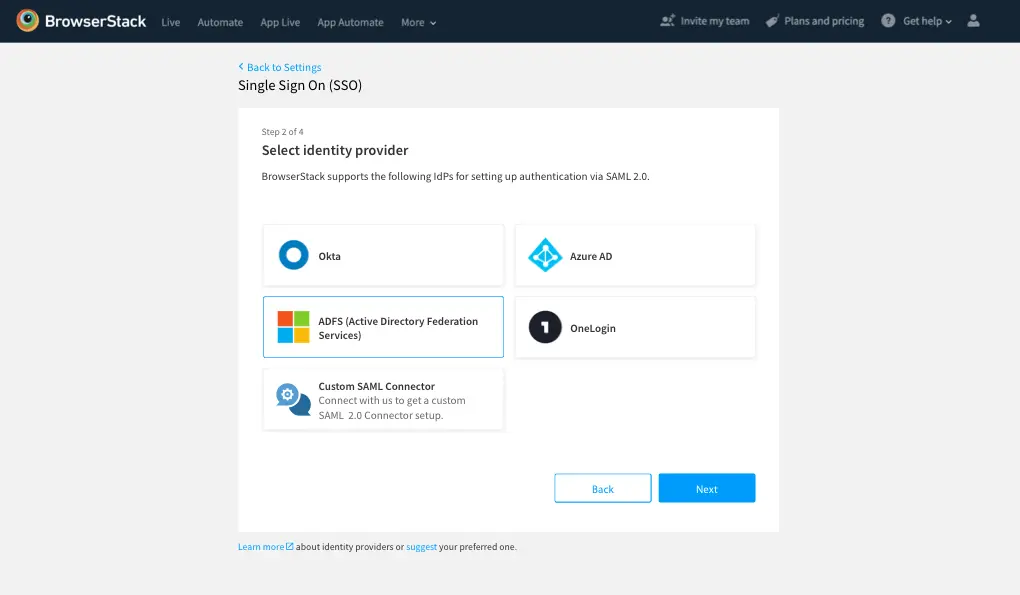 Integrate your ADFS directory with BrowserStack to set up Single Sign-On.