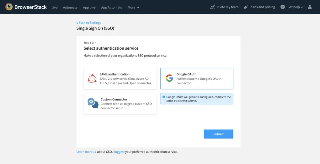 On the next screen, you will be shown all the Authentication services that BrowserStack supports, select Google OAuth, and click Submit.