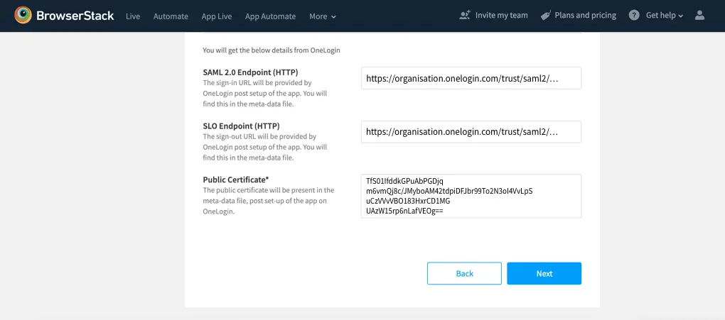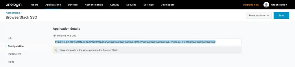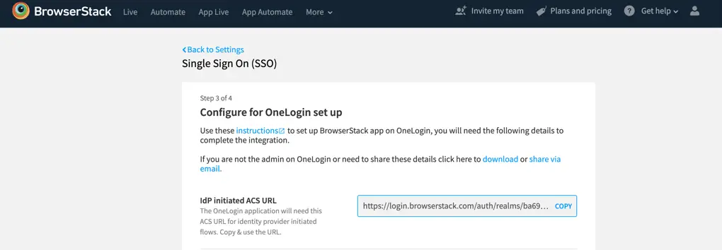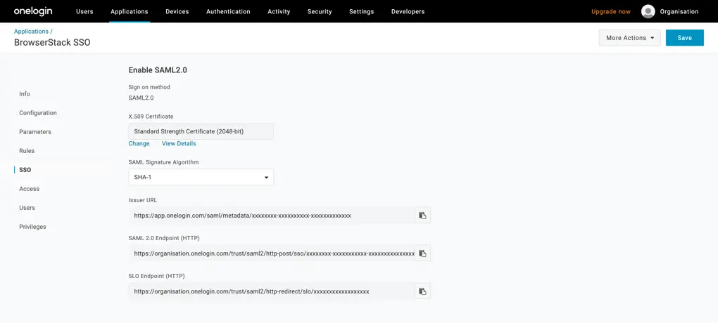 Go to the SSO tab in OneLogin. Copy the following for the next steps on BrowserStack