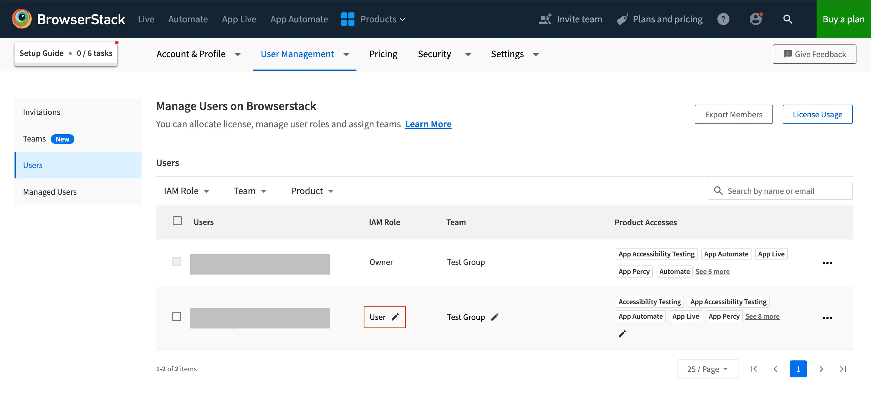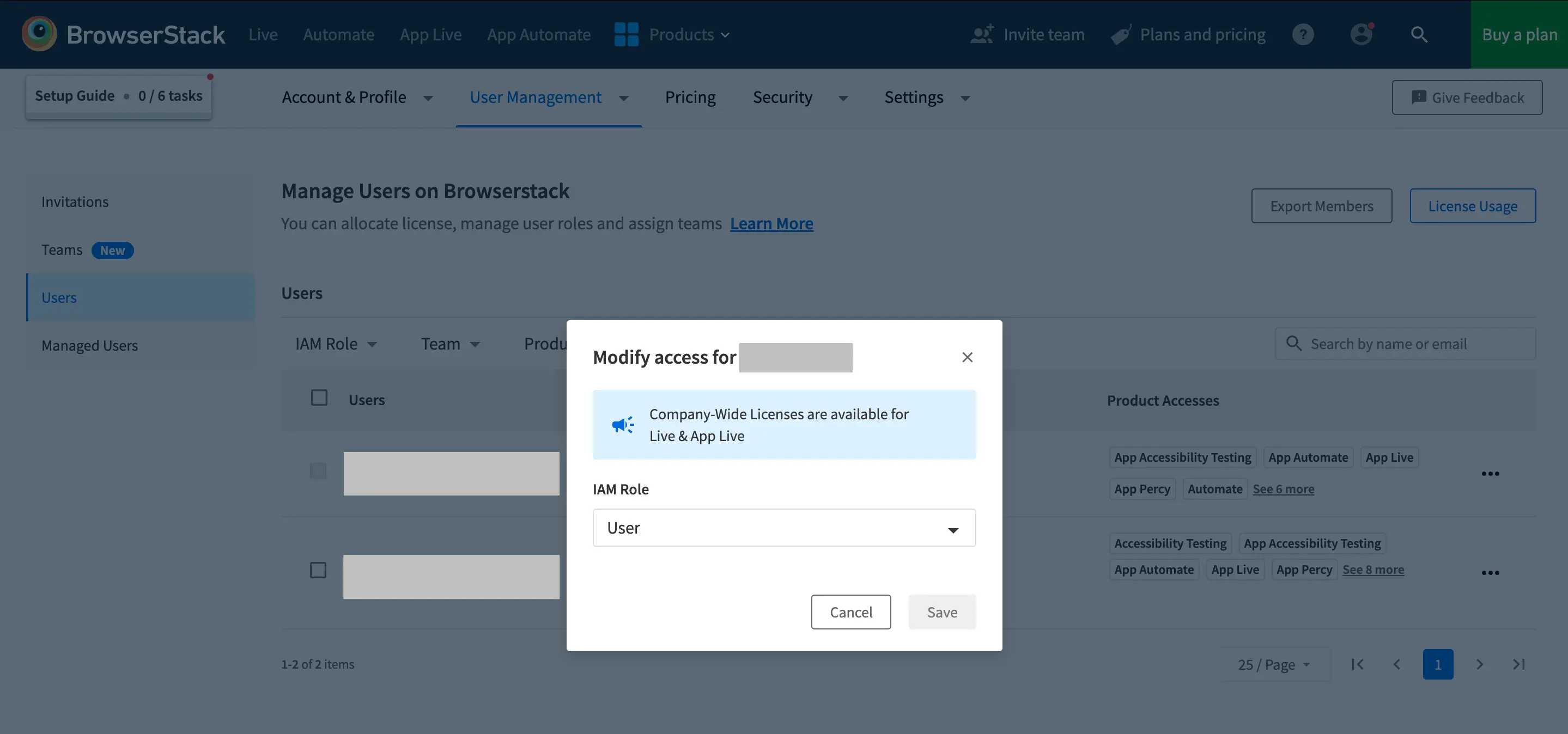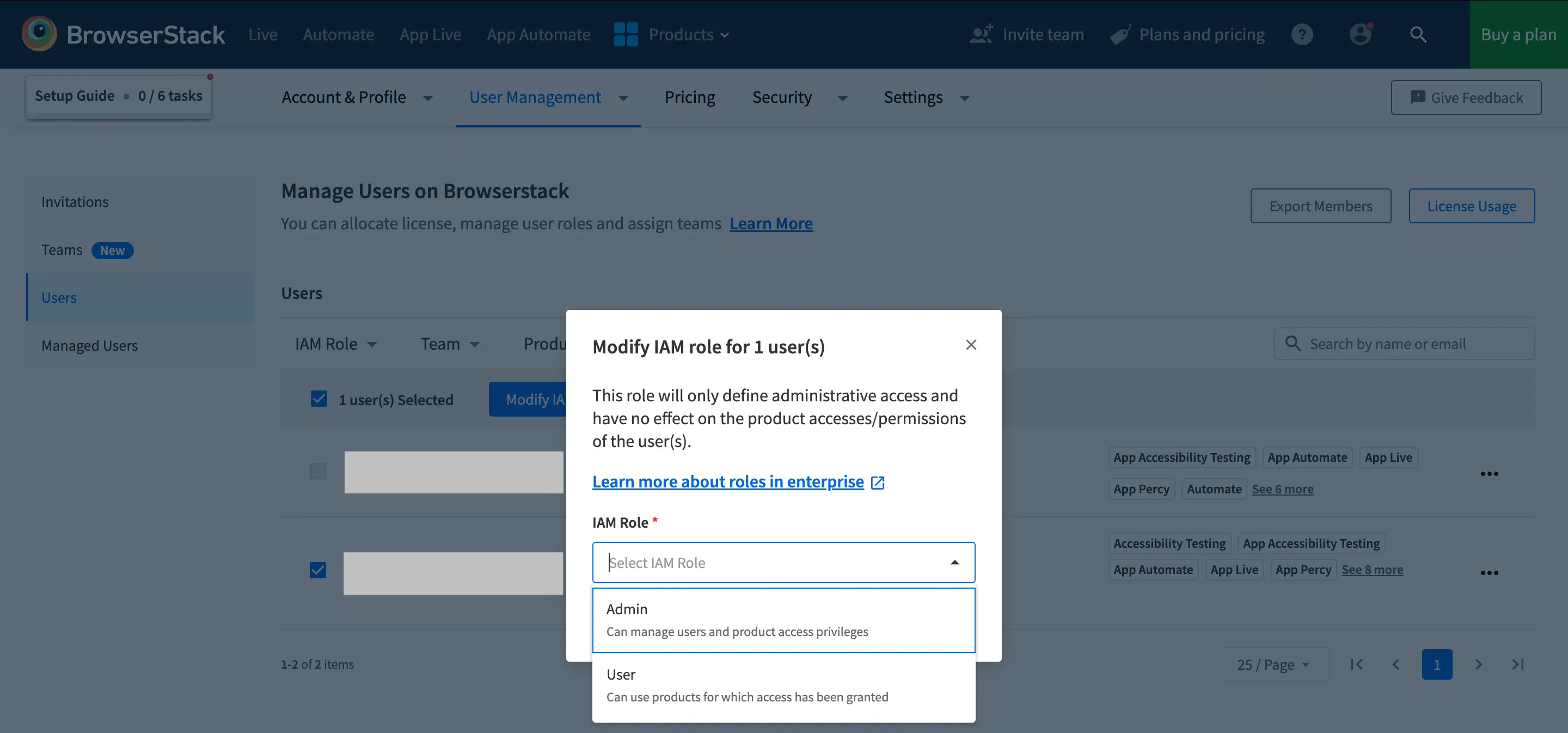 BrowserStack allows you to perform bulk actions for modifying role by performing the following steps: