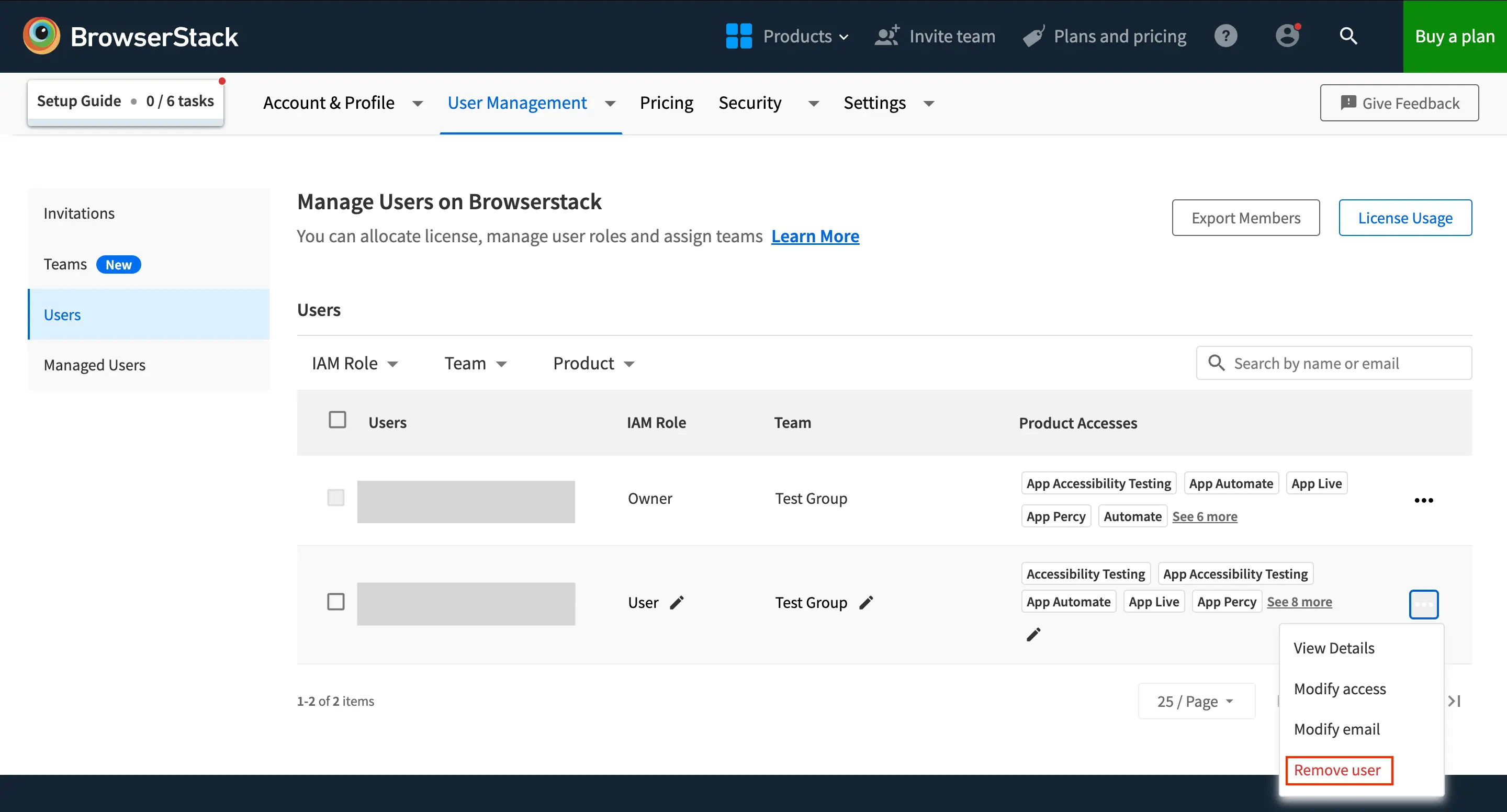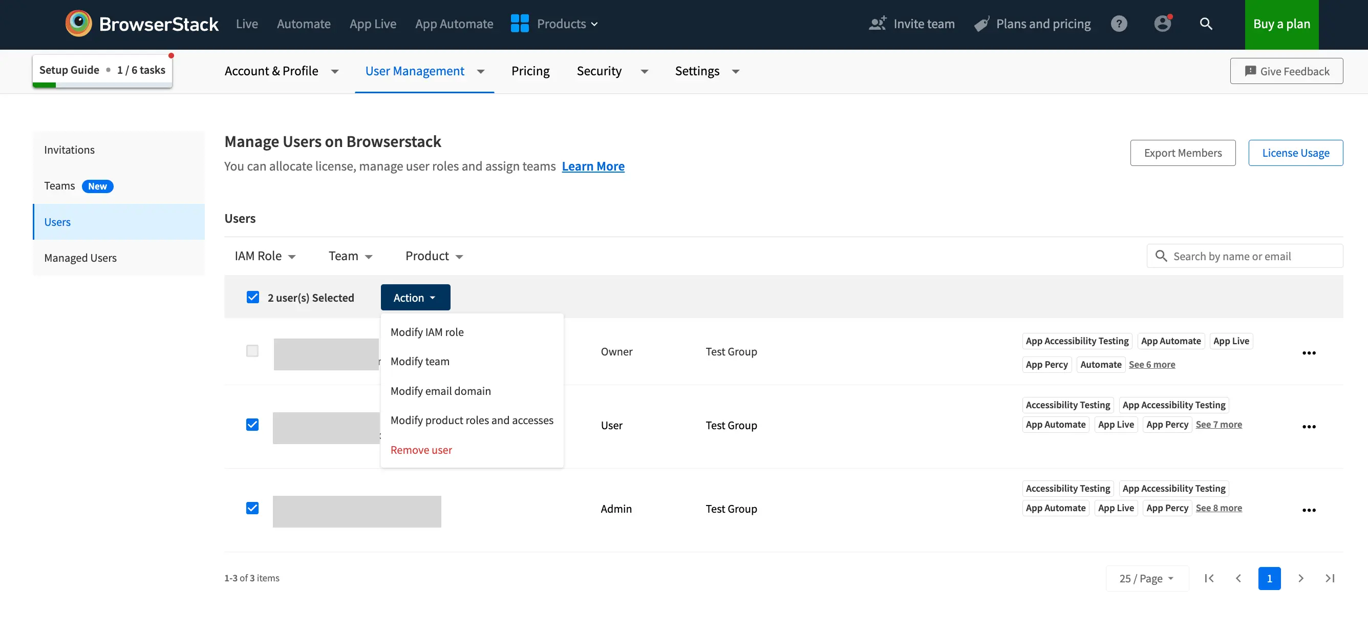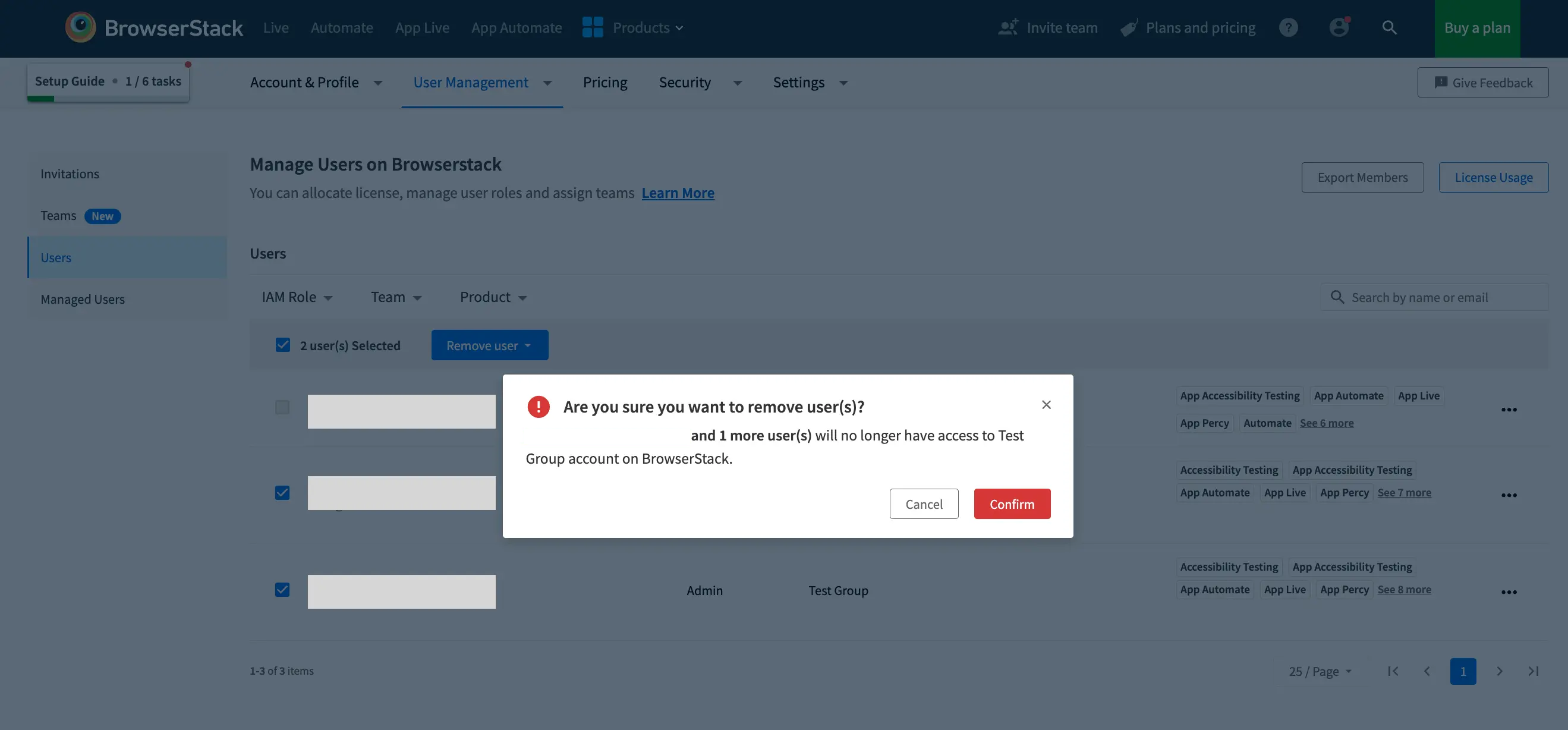 BrowserStack allows you to perform bulk actions for removing users by performing the following steps: