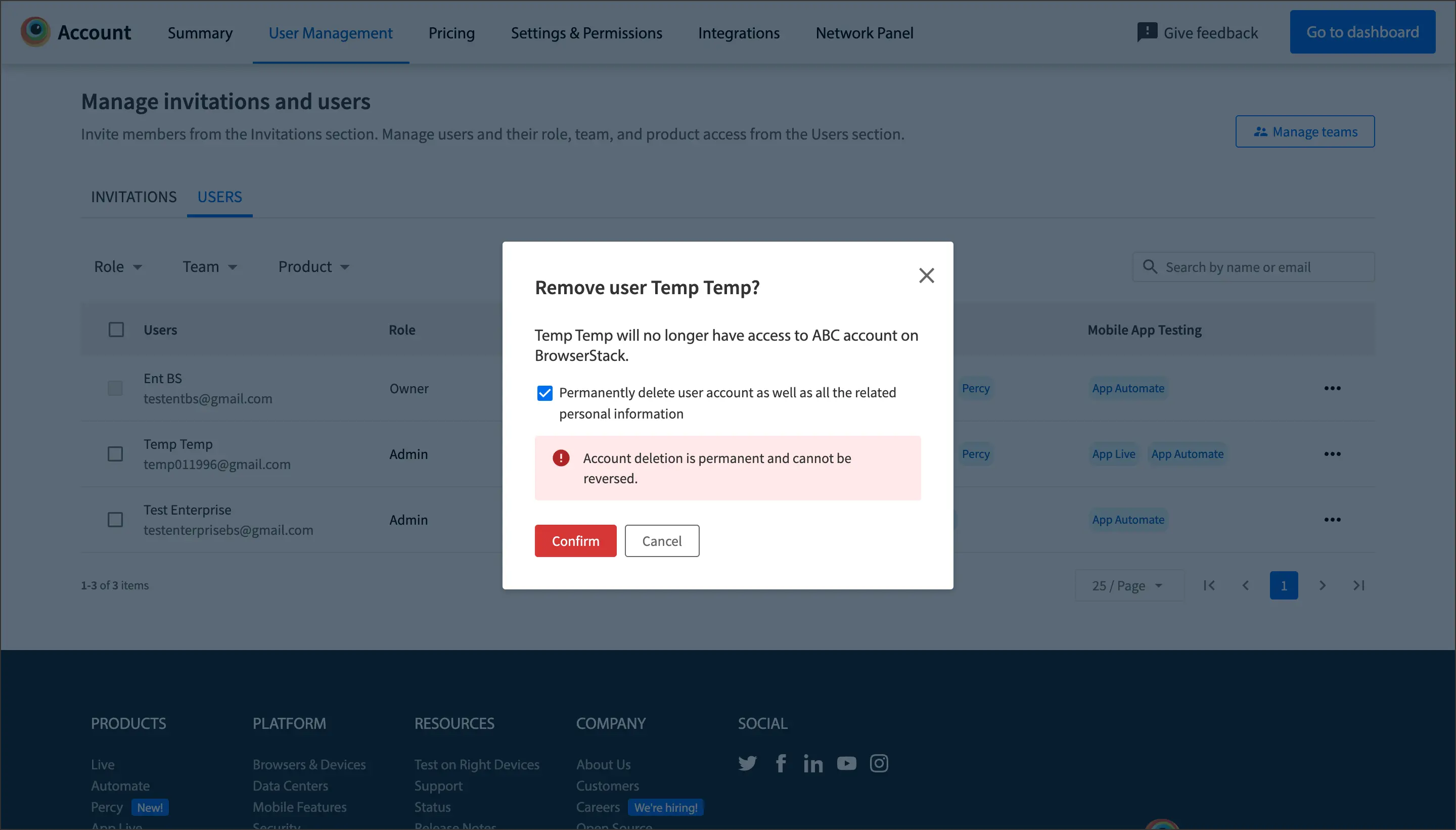 - The team member receives an email telling them that they have been removed from the Organization account on BrowserStack.