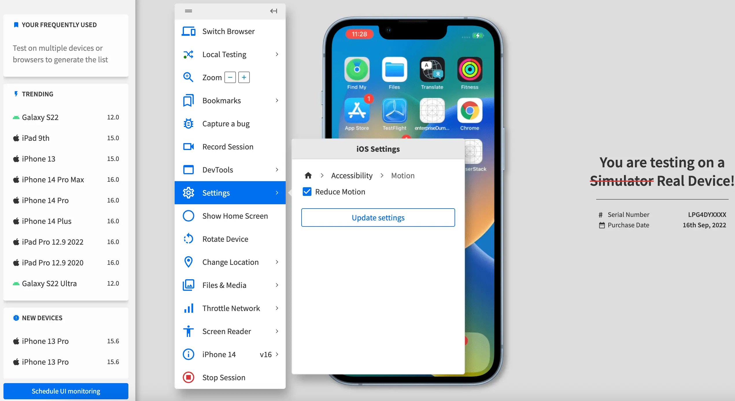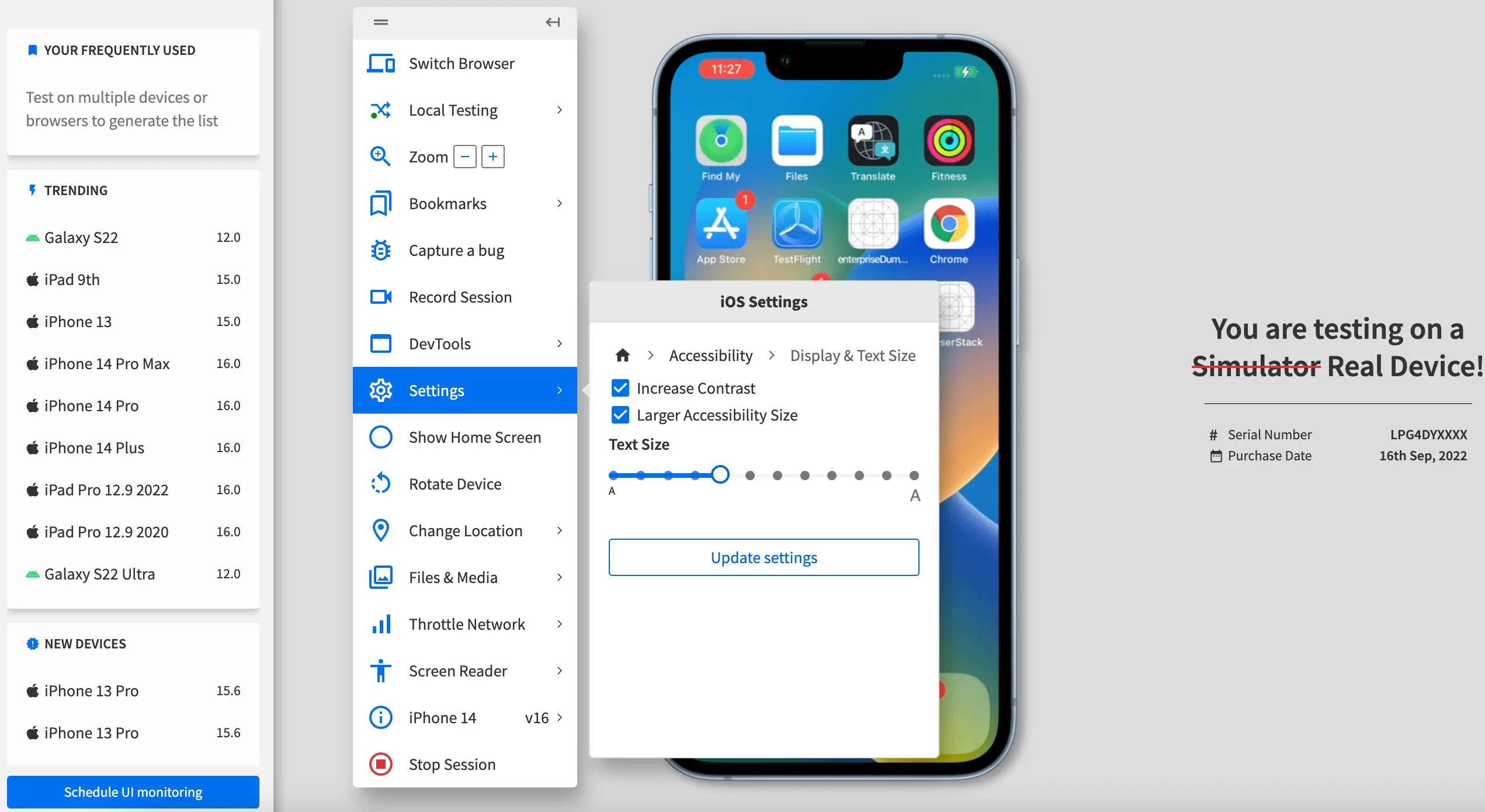 Live provides access to select accessibility settings on BrowserStack real iOS devices, to enable accessibility testing of your websites/web apps.