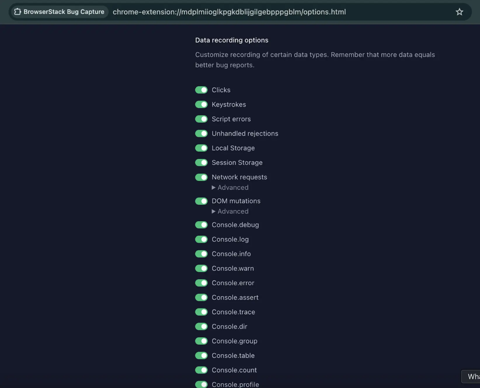 To help your team spend less time on reporting and fixing bugs, Bug Capture collects technical data generated while you interact with your product. This data includes general information such as your browser version, operating system, time of recording, console logs, URLs visited during the recording, network logs, and more.