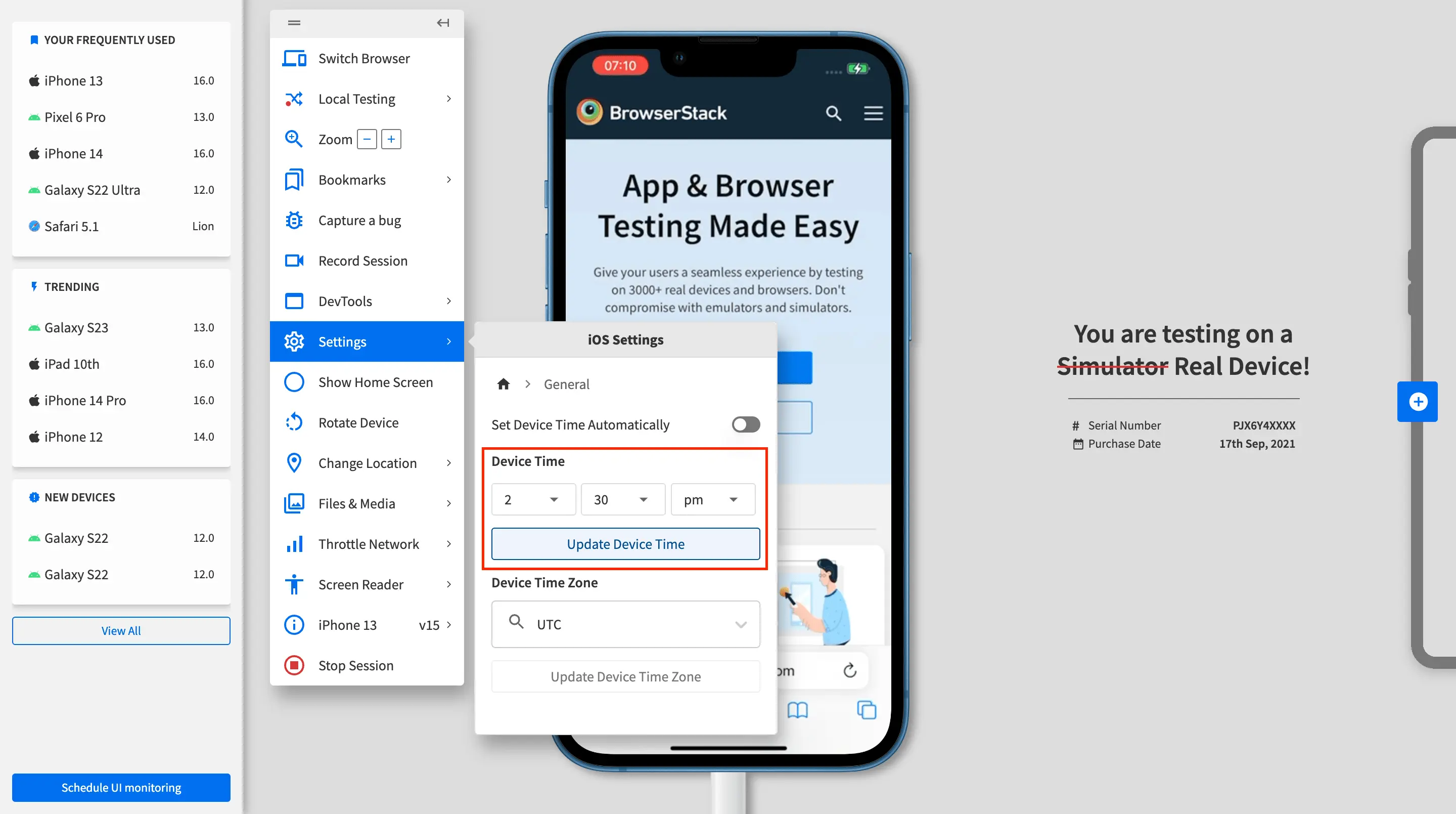 Set time on BrowserStack real iOS devices
