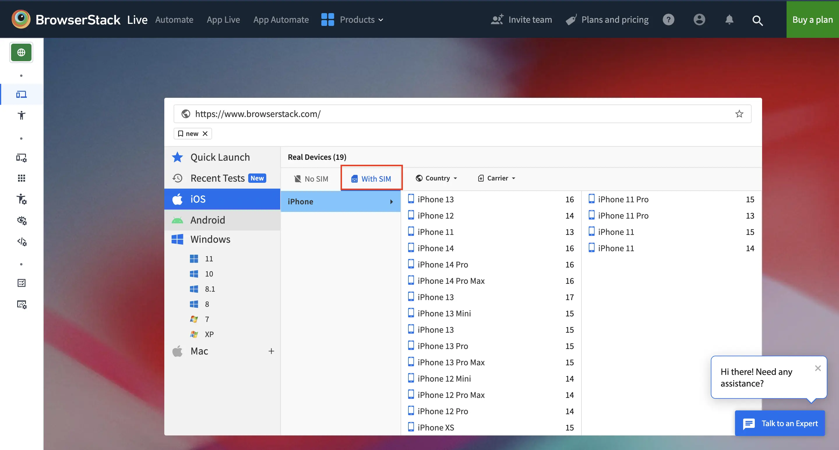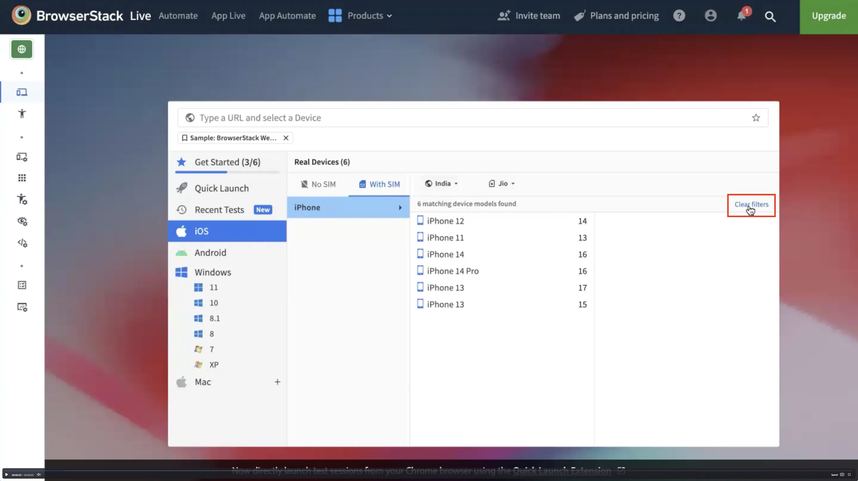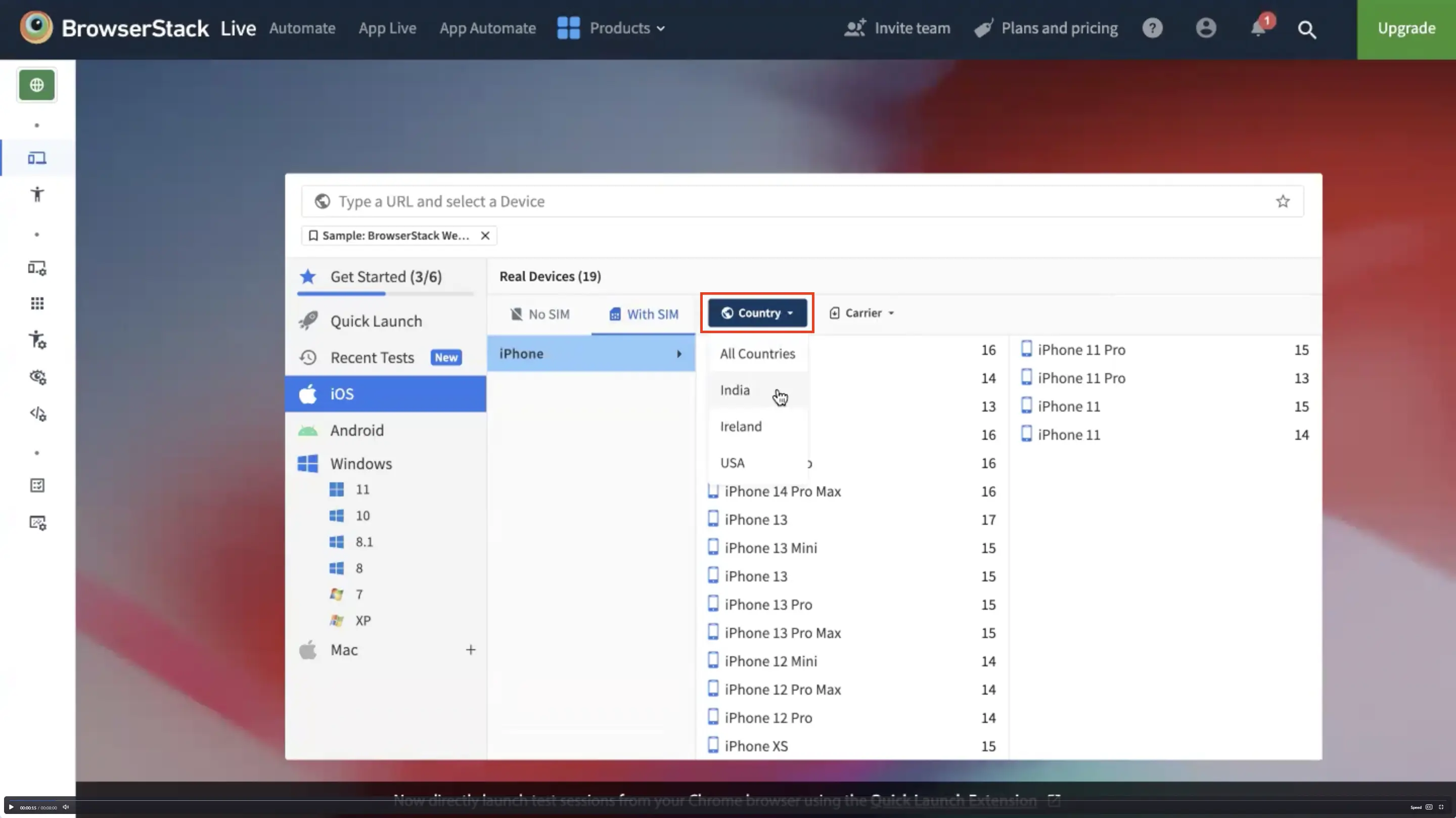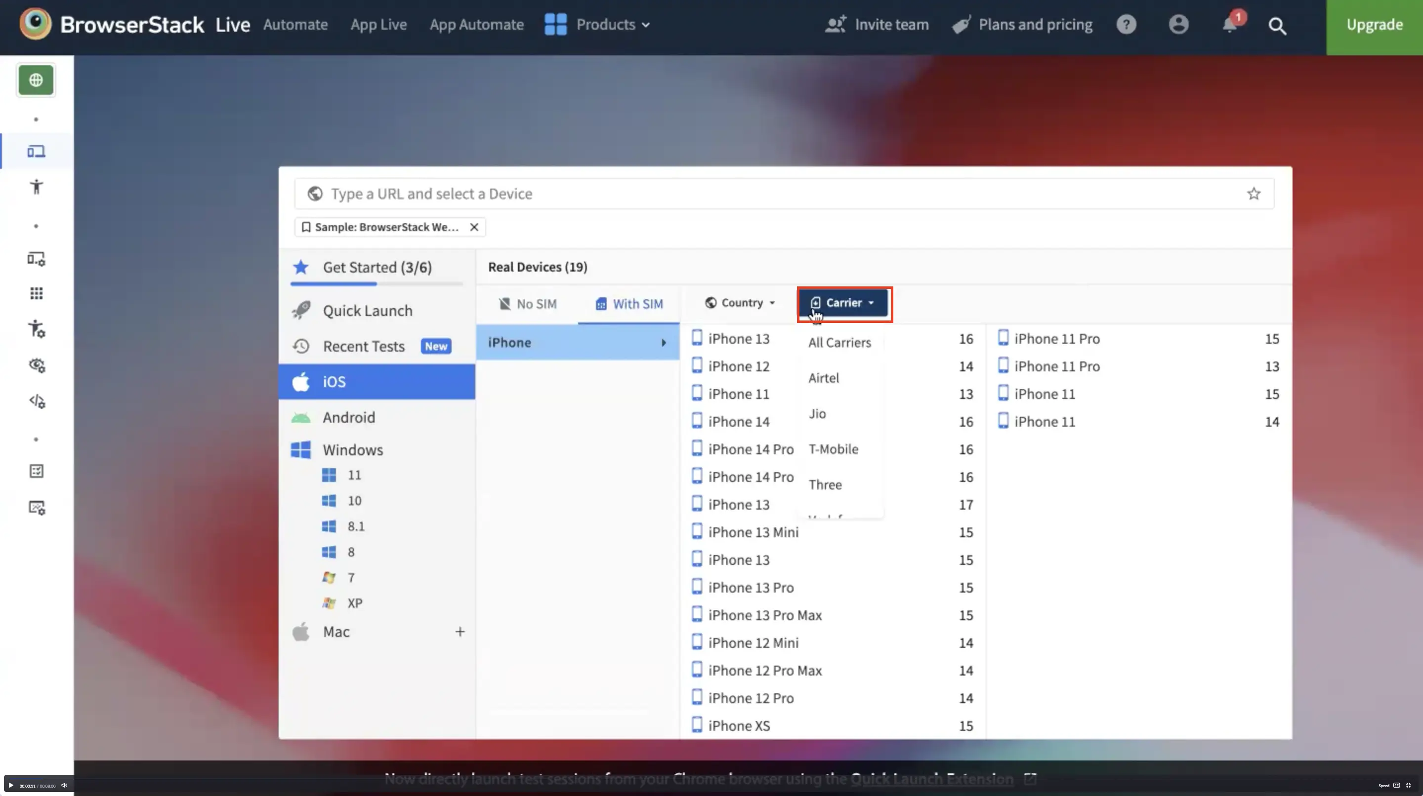 Live provides access to SIM and embedded SIM (eSIM) enabled BrowserStack real iOS devices. eSIM is currently available with iPhone 13 and iPhone 14 devices only.