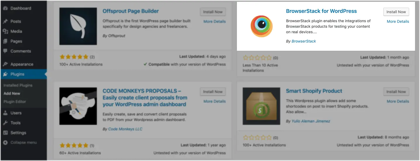 Step 1: Visit your plugin page from your Wordpress dashboard and search for BrowserStack.