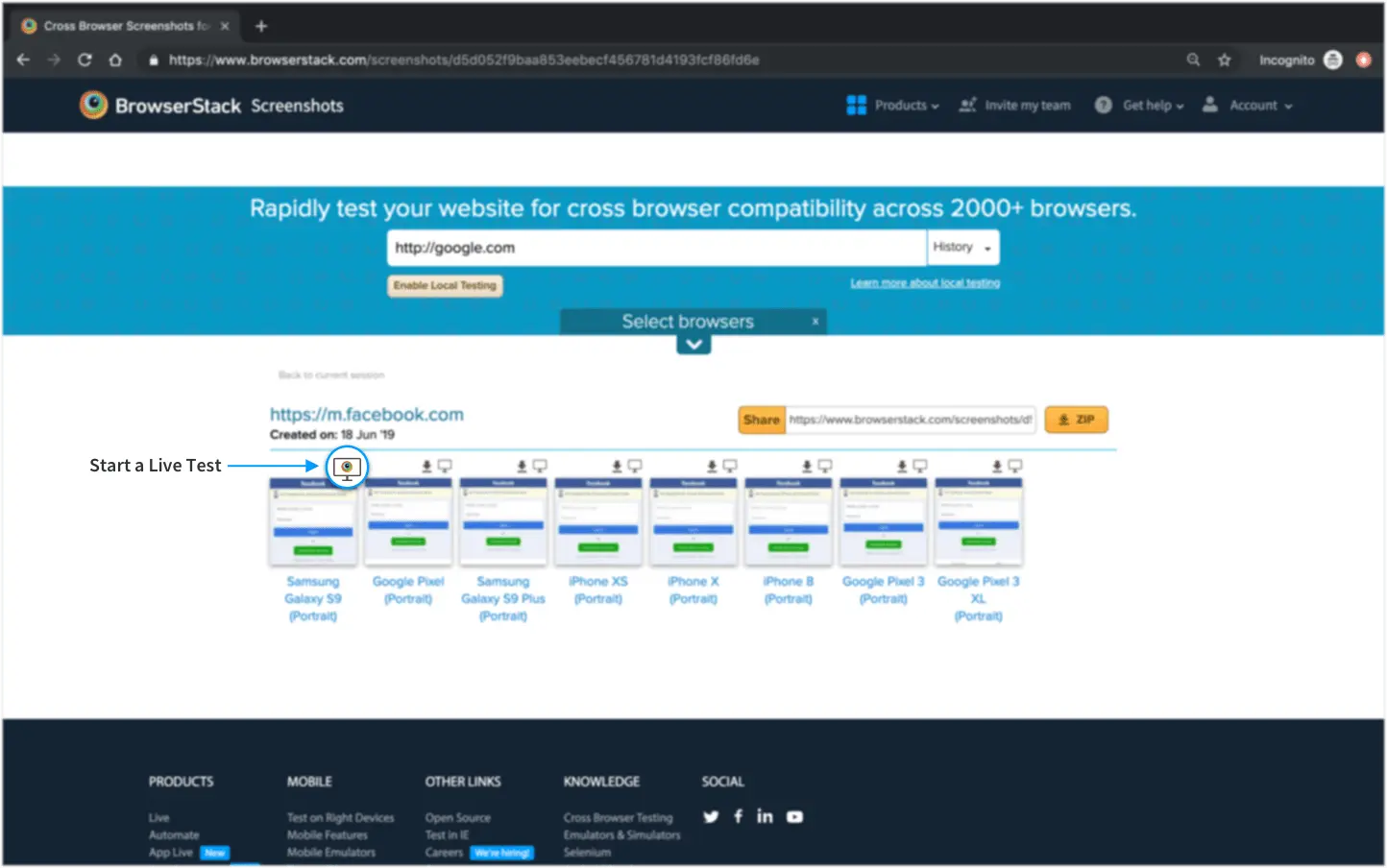 If you are already logged into BrowserStack, you will get your screenshots across ten different responsive desktop and mobile combinations.