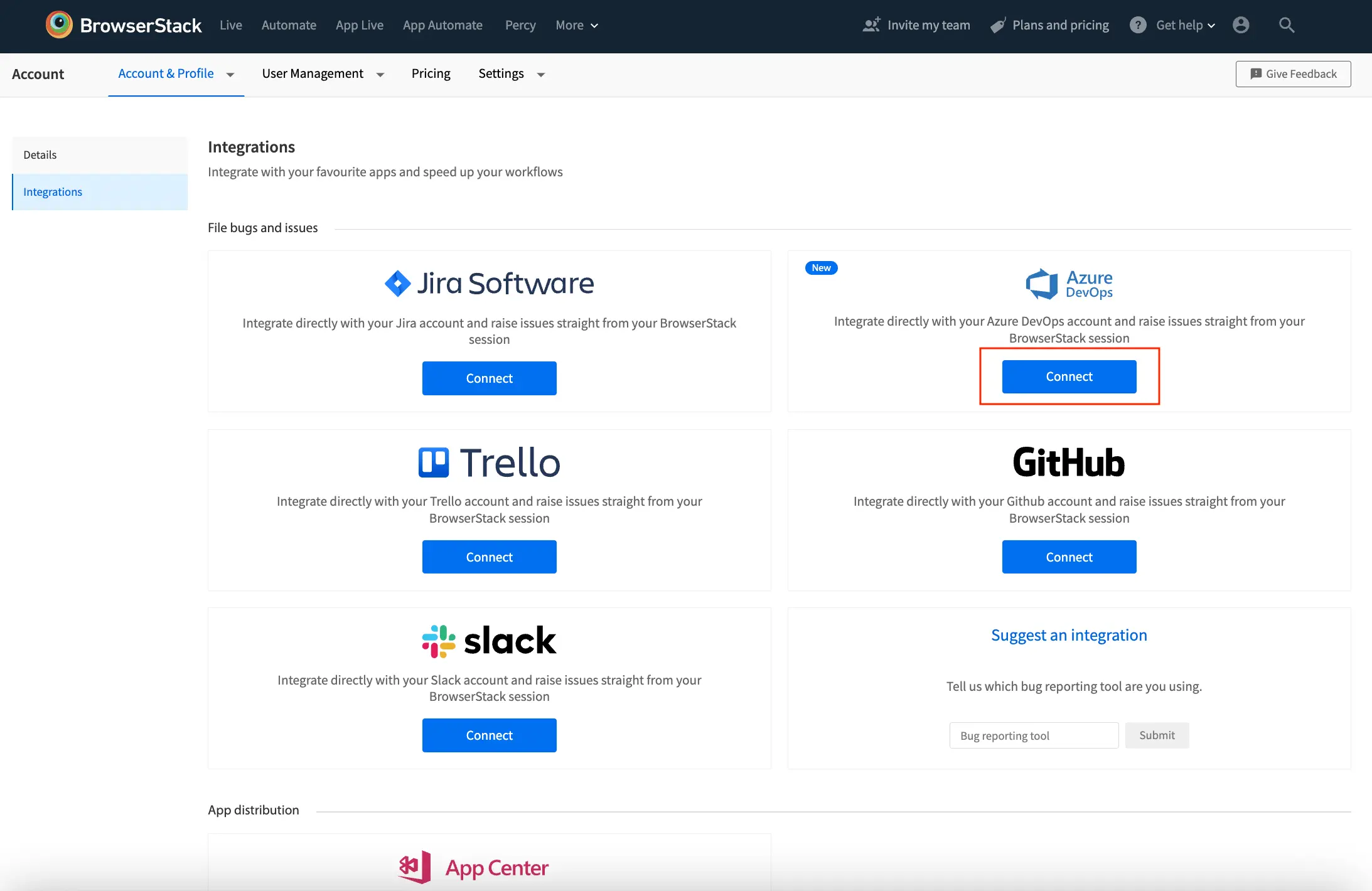 - Option 1: Integrate using your BrowserStack account Integrations page.