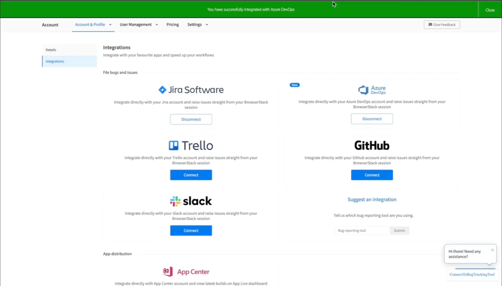 You see a message on the dashboard that you have successfully integrated BrowserStack Live with Azure DevOps.