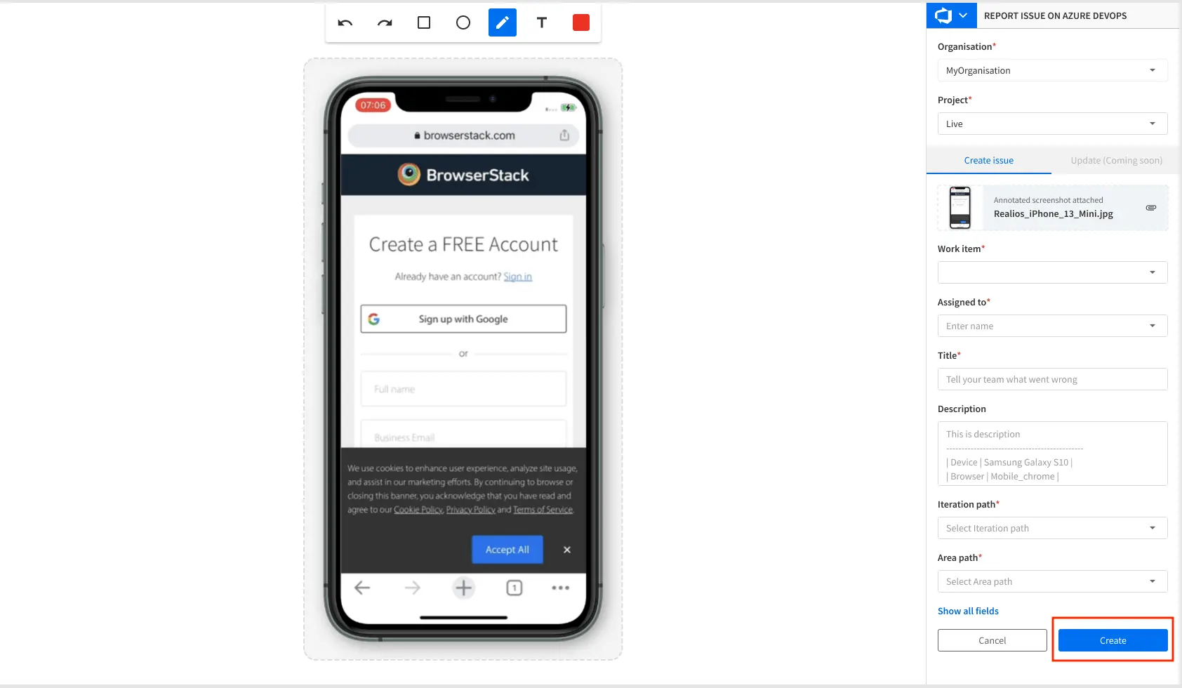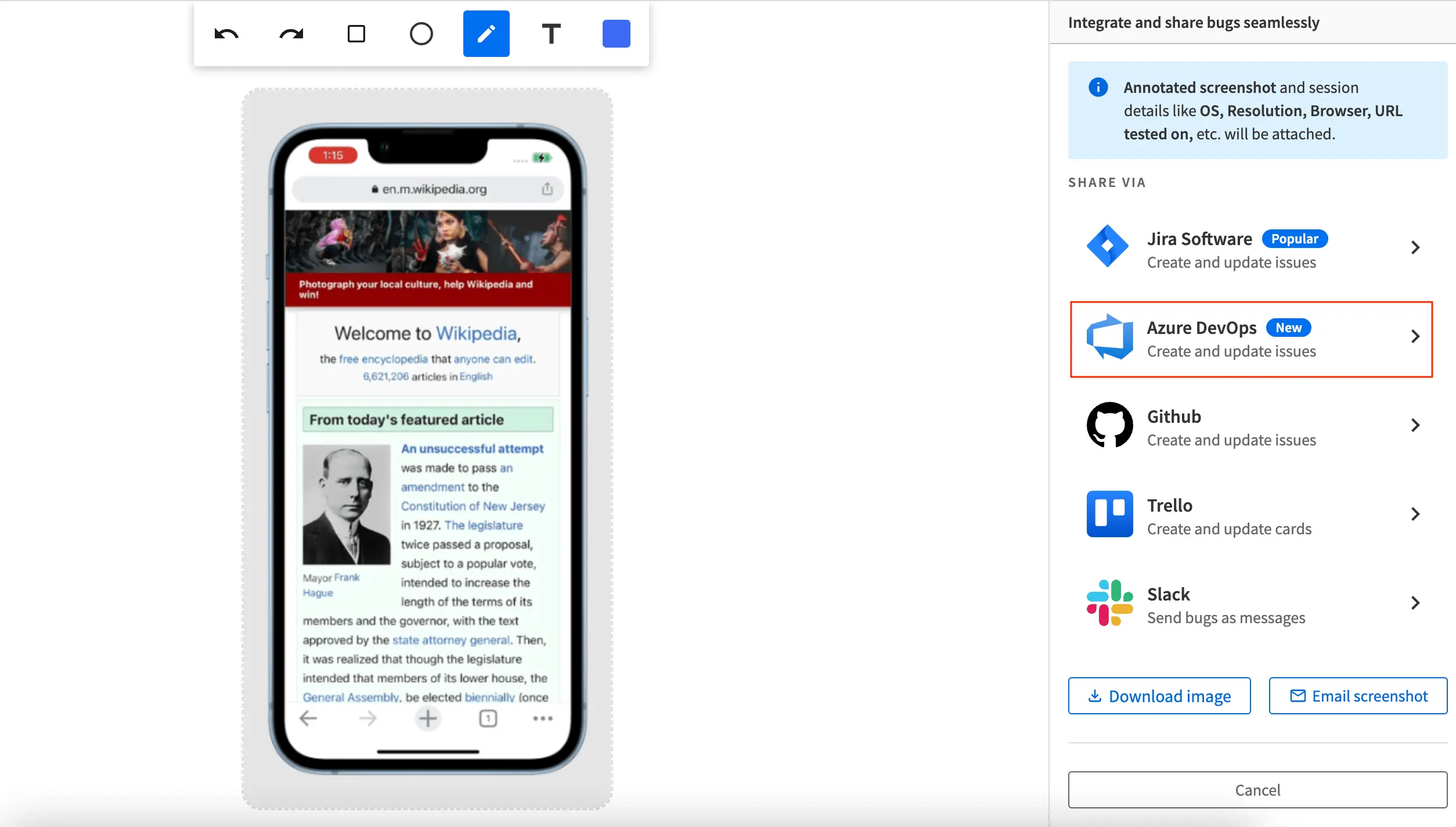 Live enables you to report bugs or issues using our Microsoft Azure DevOps integration. While testing websites/web apps using Live, you can capture screeshots of bugs, annotate screeshots using the Live annotation toolbar, and report bugs in Azure DevOps projects.