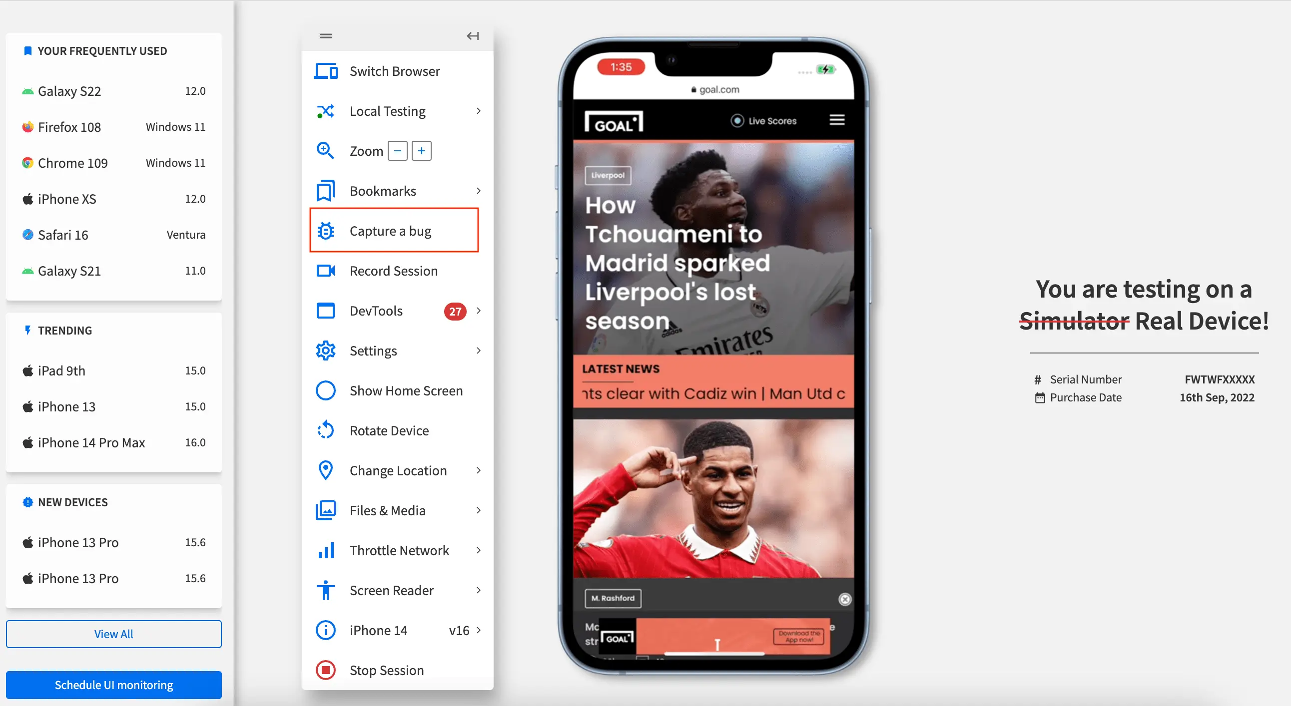 - On to the Live dashboard, select the device-browser combination to start your test session.