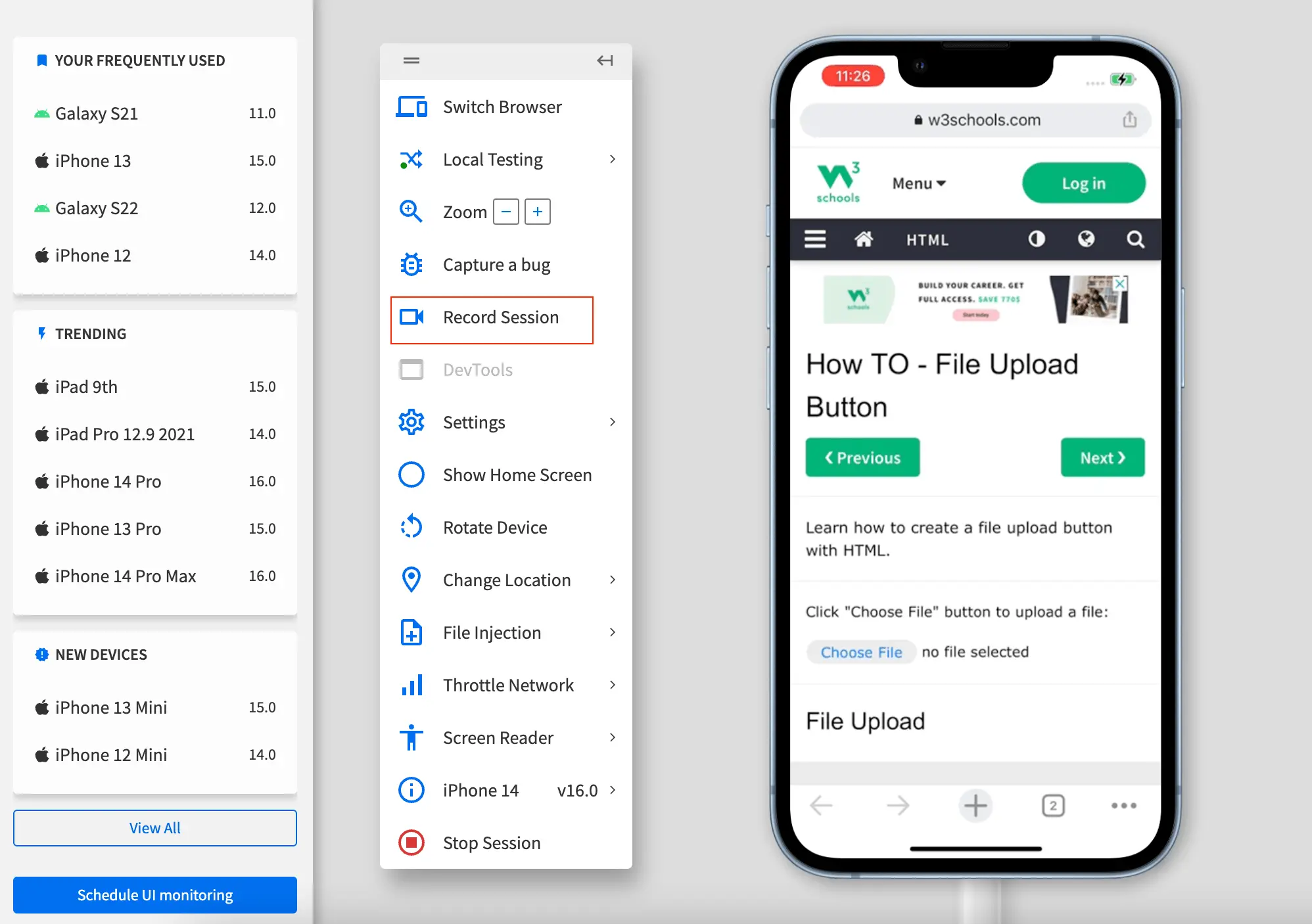 - Select the device-browser combination to start your test session.