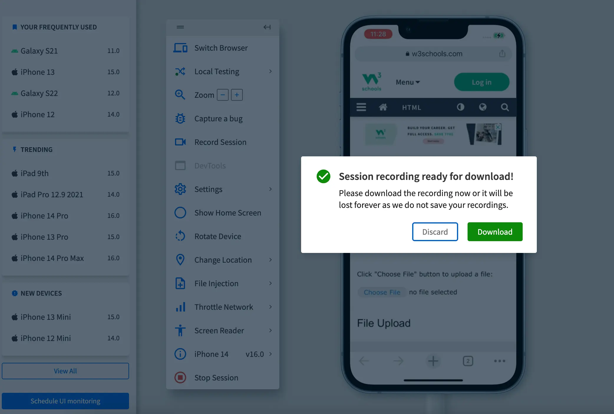 If you discard the video, you cannot retrieve it later, as your video is permanently deleted and is not saved on any BrowserStack device or server.