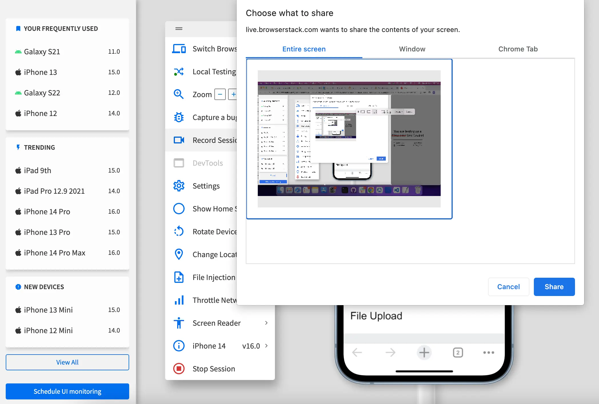 - Select any of the following and click Share to start recording your session: