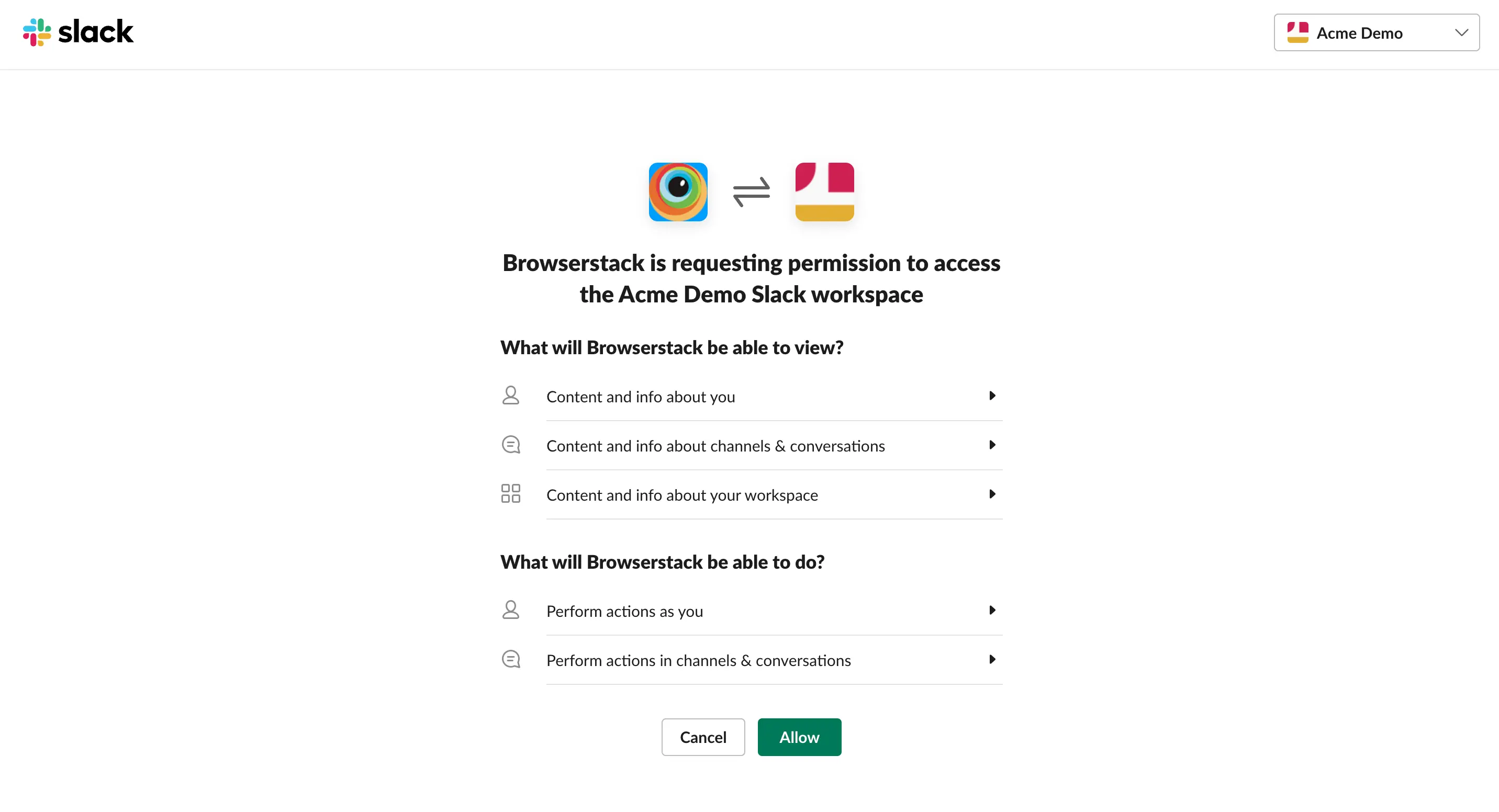 Step 3: Click on Authorize to give permission to BrowserStack to post messages for you on Slack.