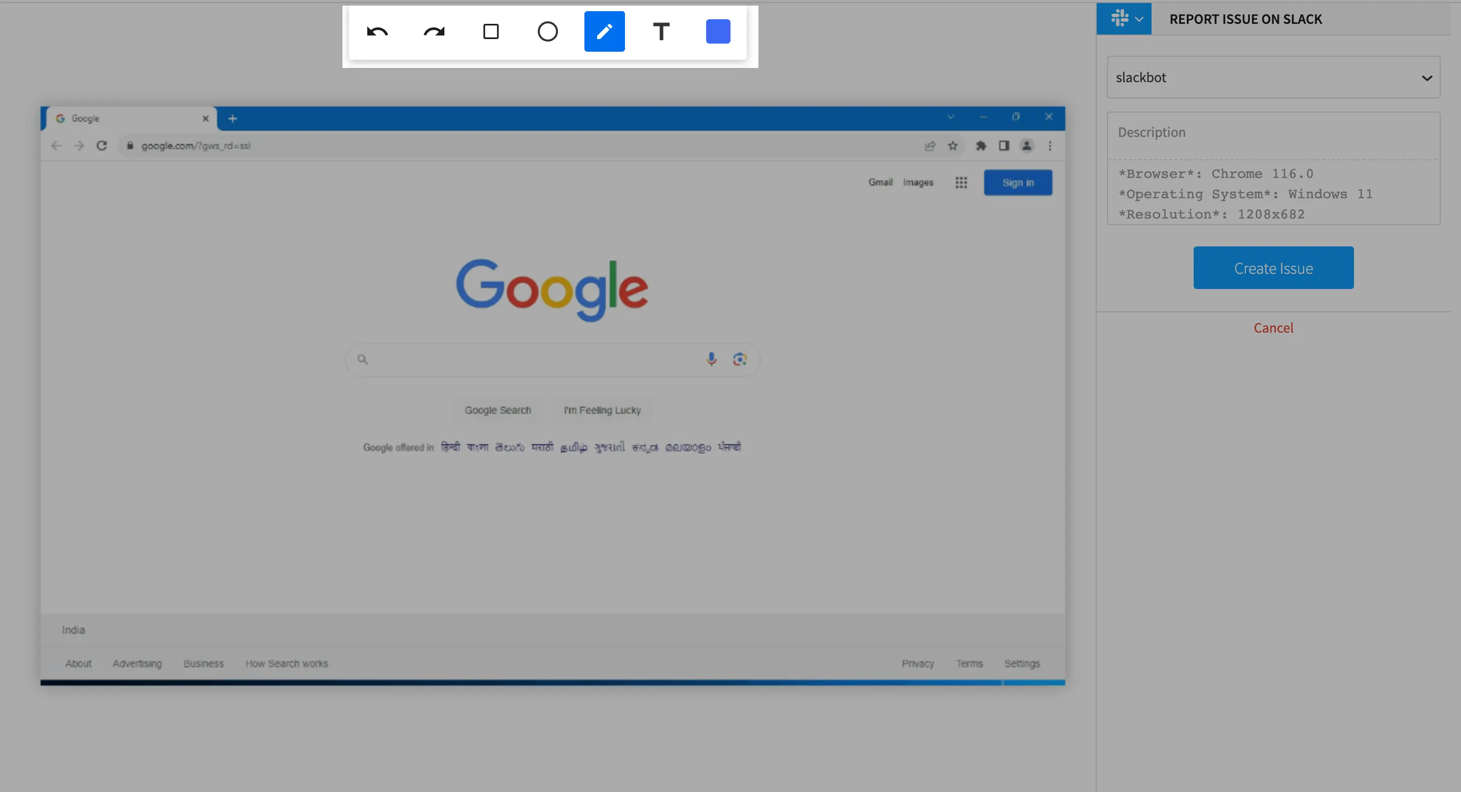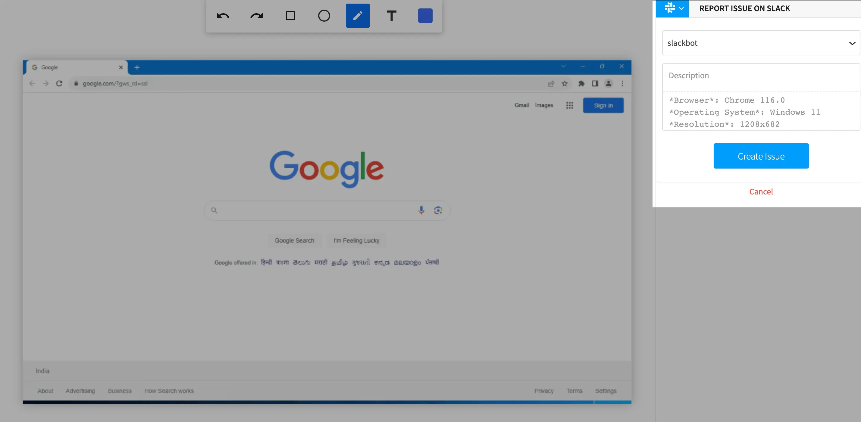 Step 3: Enter the channel name or the username whom you want to send the details of the bug. Additionally, you can fill in a description as well to personalize the message as per your need. Once the details of the bug are filled in, click on Create Issue to send across the message on Slack.