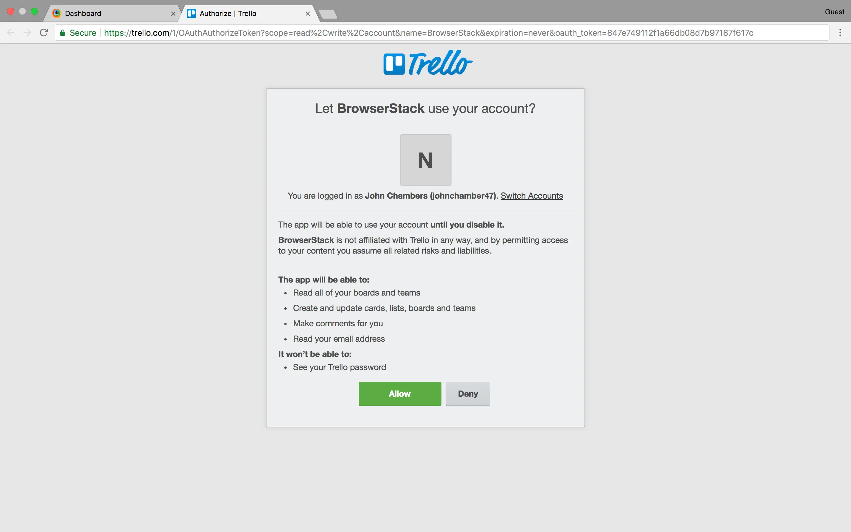 Step 3: Click on Allow to grant permission to BrowserStack to access your Trello Board details.
