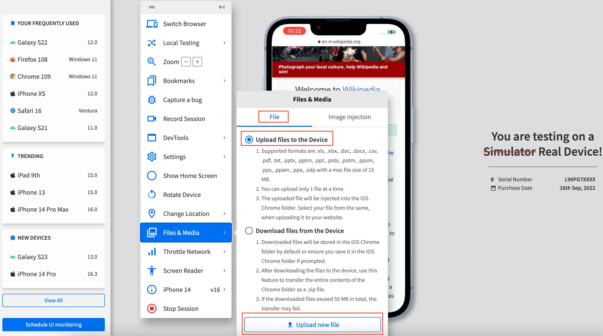 Live enables you to upload files to BrowserStack real devices and access the files to test the file upload functionality of your websites.
