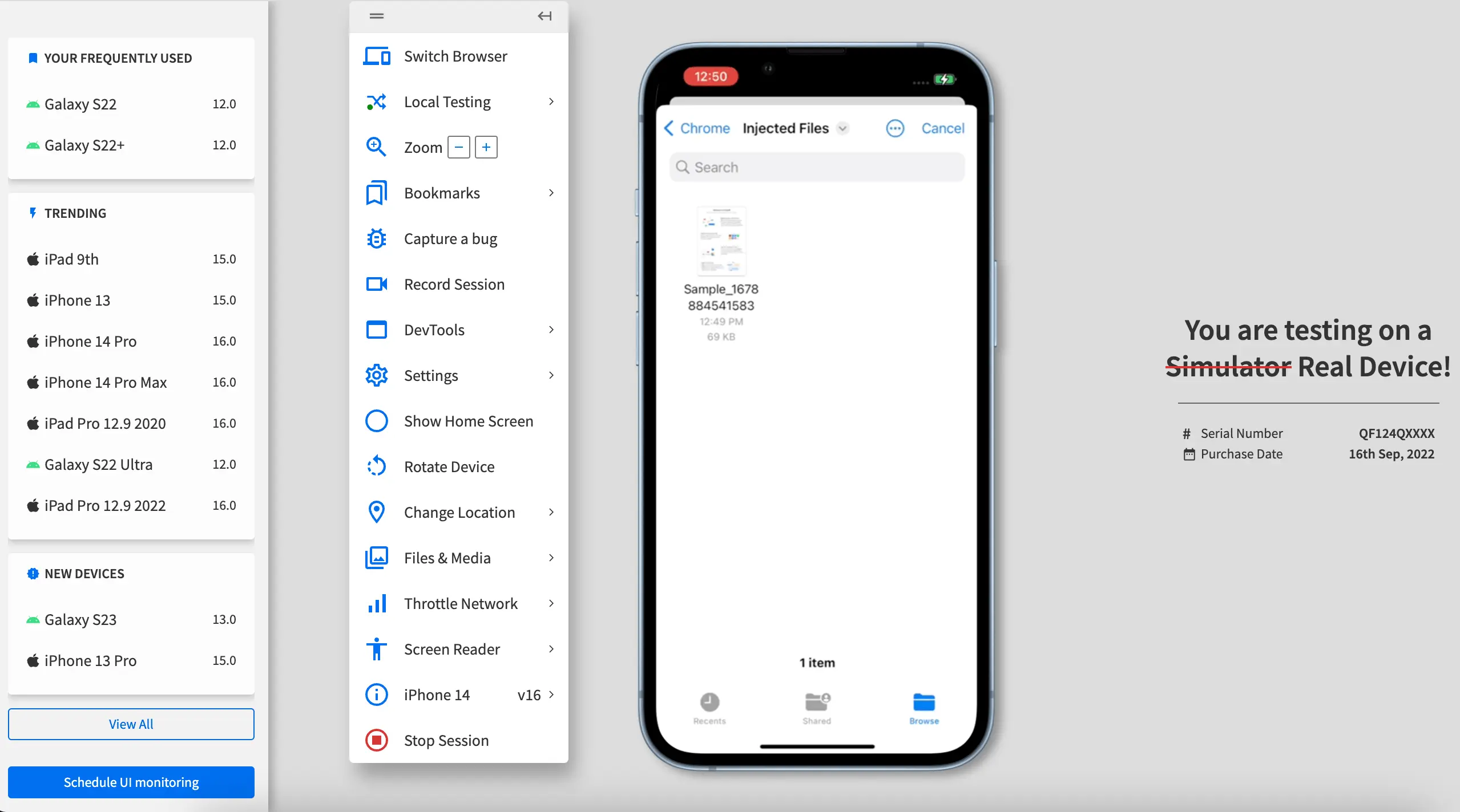 You see a message on the dashboard that the file is uploaded successfully. The uploaded file is available in the Chrome > Injected Files folder in the Files app of the BrowserStack real iOS device.