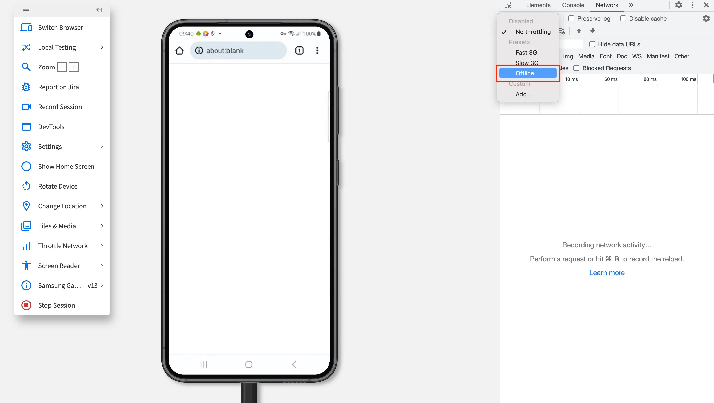 • Choose a preset network profile: Simulates specific network conditions. Select preset network profiles