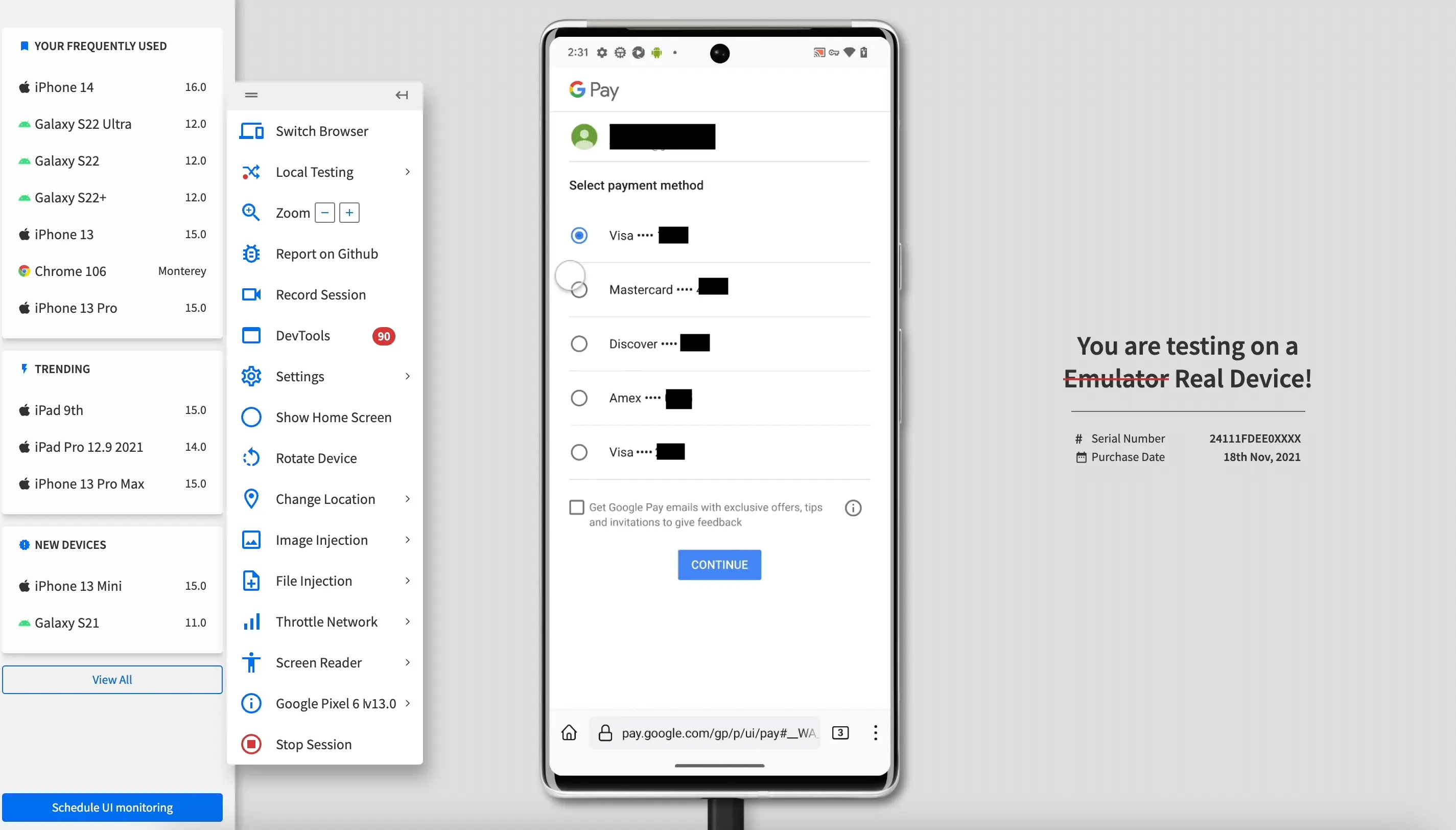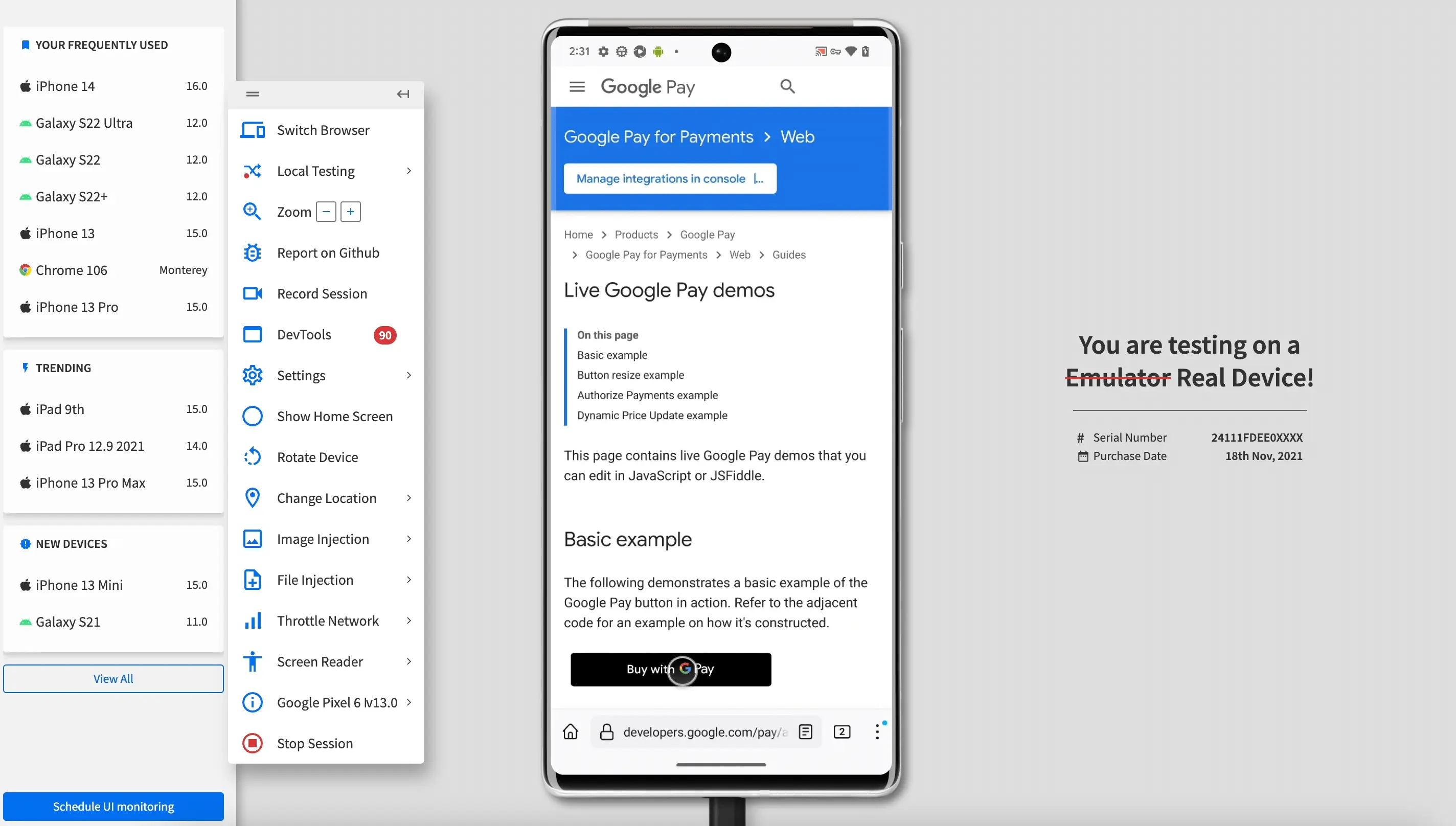 Test the payments testing flow for your websites or web apps that use Google Pay as a payment method on real Android devices. The special devices and feature flow is only necessary if you test Google Pay with the Android-Chrome combination. For all other combinations (iOS - Chrome, iOS - Safari, Android - Firefox), the regular devices on your account should work.