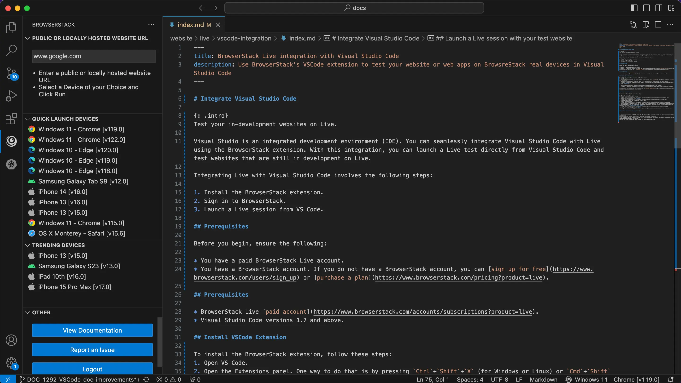 Visual Studio Code (VS Code) is a commonly used Integrated Development Environment (IDE). You can seamlessly integrate VS Code with Live using the BrowserStack extension. With this integration, you can launch a Live test session directly from VS Code and test your in-development websites on Live.