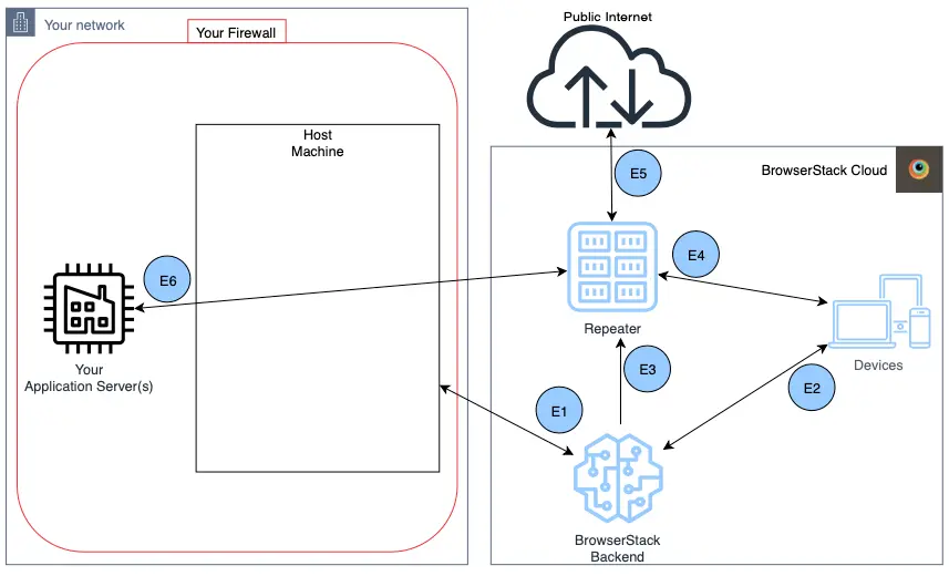 E1 Host Machine makes a call to BrowserStack backend, to signal start of testing session.