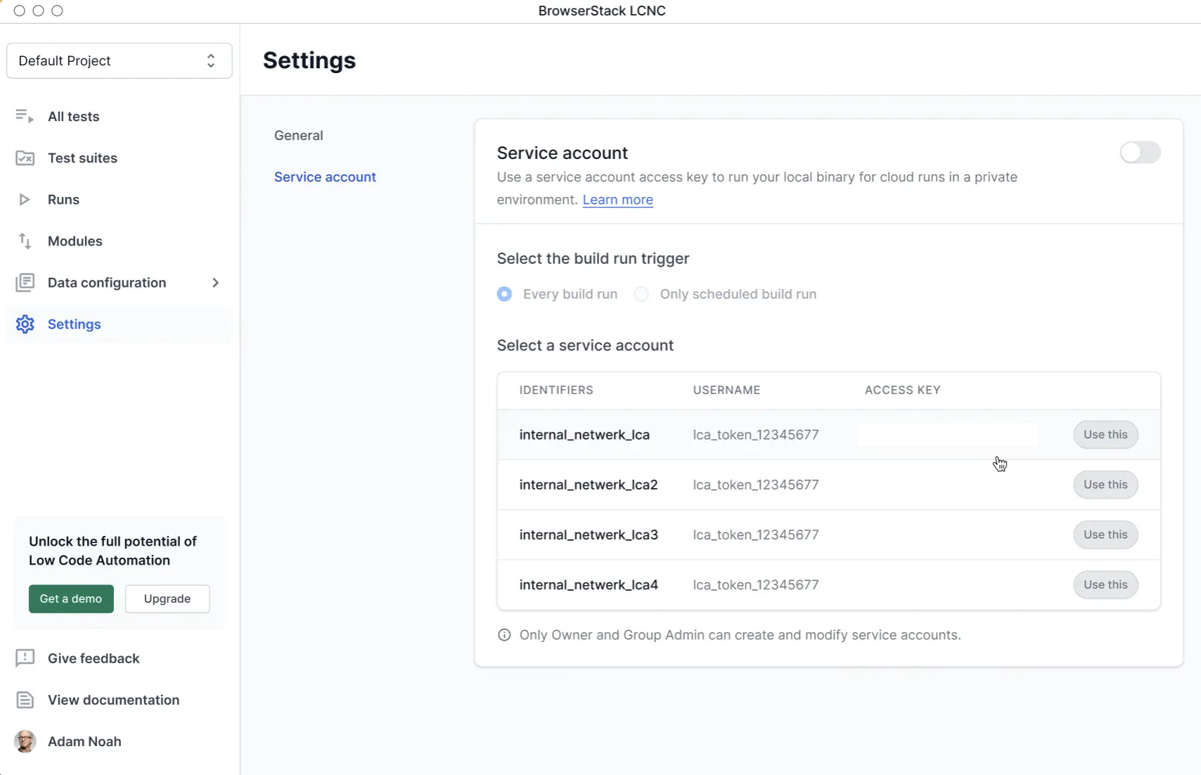 The Service Account feature in Low Code Automation enables organizations to securely authenticate and trigger test executions without relying on individual user credentials. This feature is particularly useful for teams running scheduled builds in private environments, as it eliminates the need to share a Group Owner’s access key for executing private environment based tests on cloud.