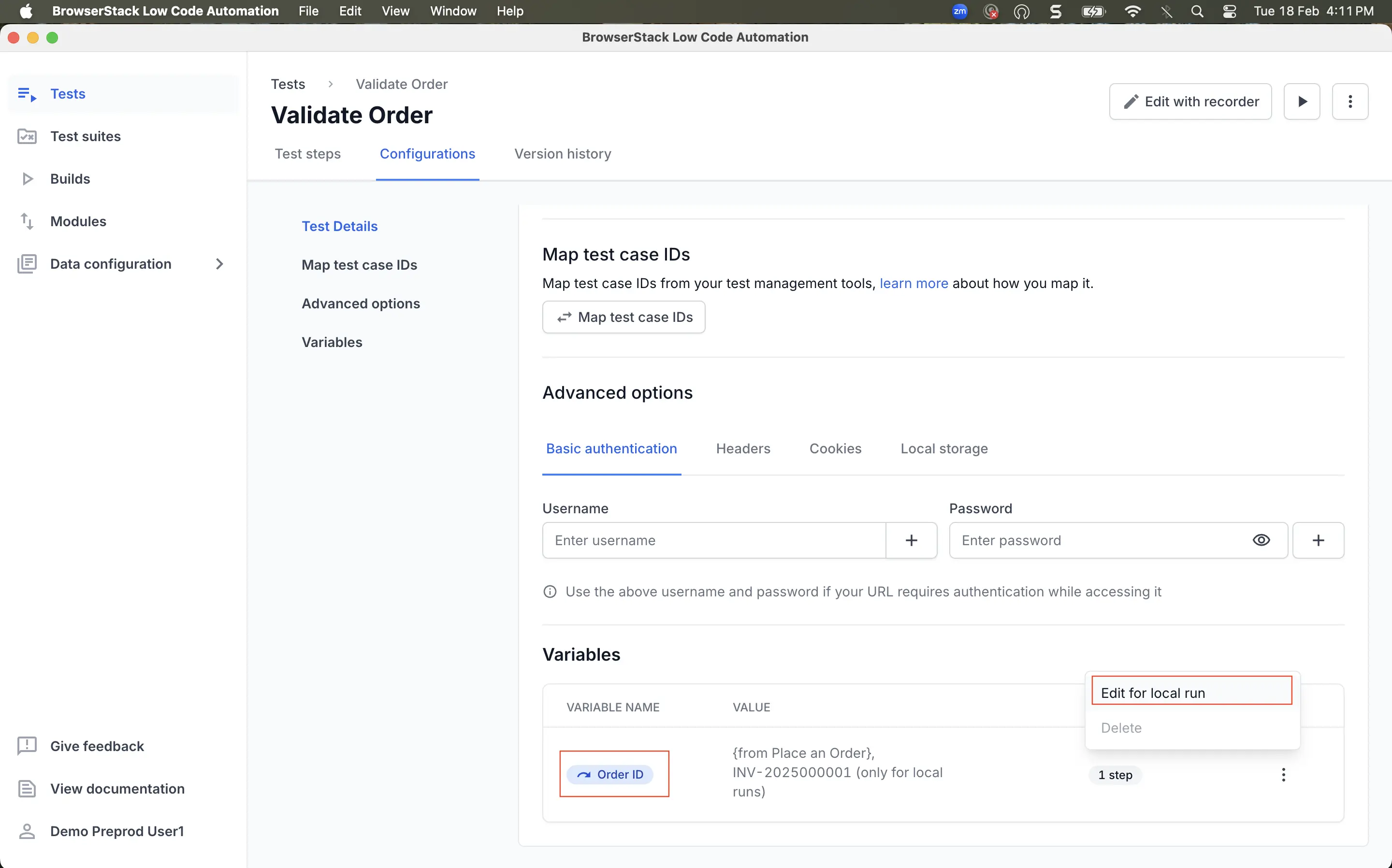 In Low Code Automation, go to Tests, select either the parent or child test, and click Configurations. Under the Advanced section, you’ll see the Variables section. It lists all the variables.