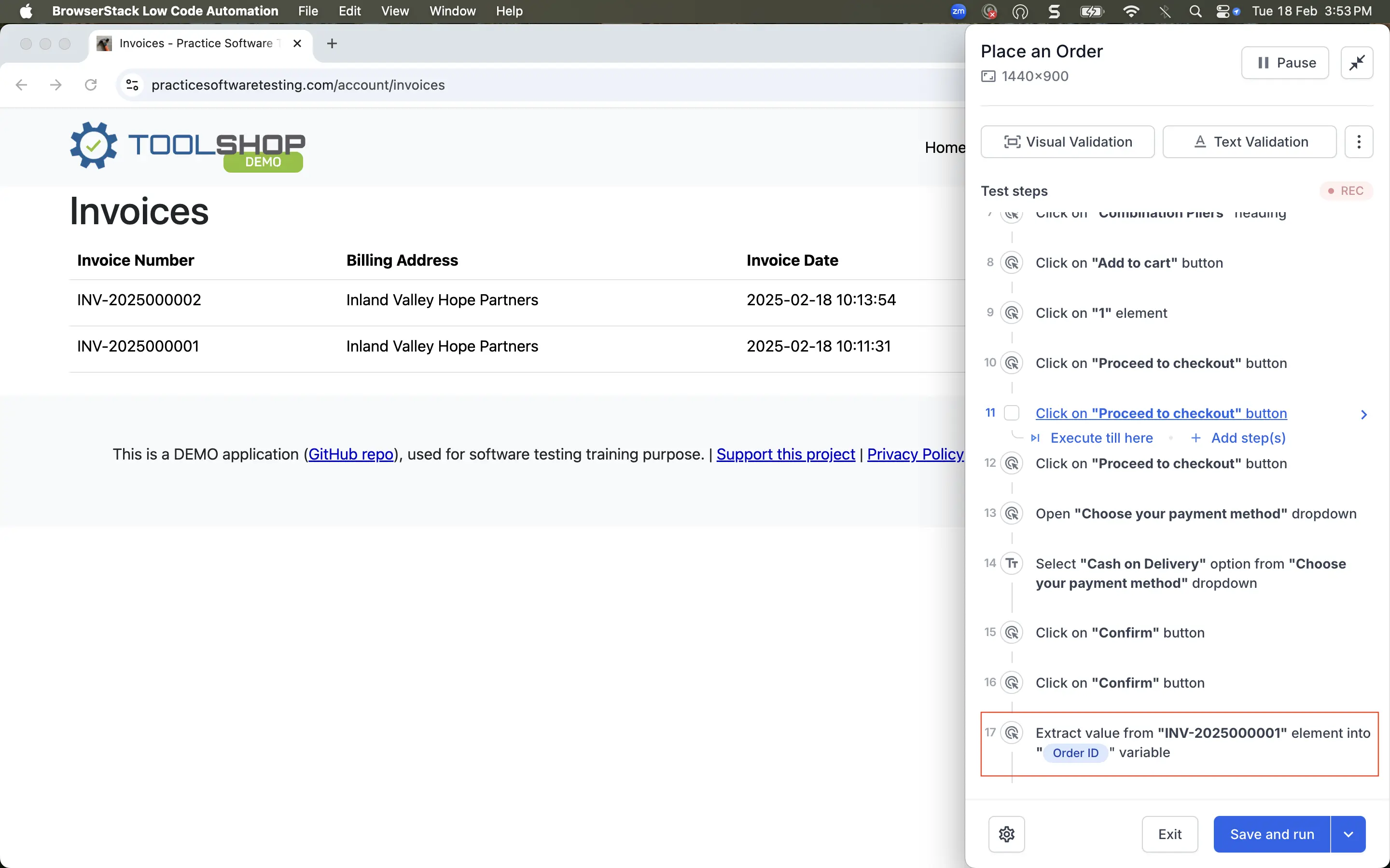 In Test 1 (Place an Order), you go to the store’s website, add items to cart, and place an order. Once the order is placed, you extract the Order ID value and save it as a variable to use it in the Test 2. For more information on how to extract the Order ID value, refer to the Extract Value document.