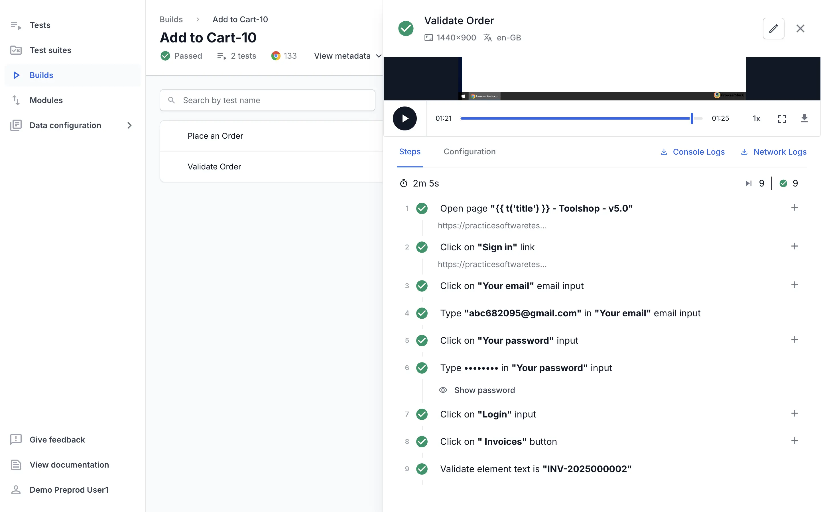 Here is a successful execution of the “Placed an Order” test, followed by the “Validate Order” test using shared data.