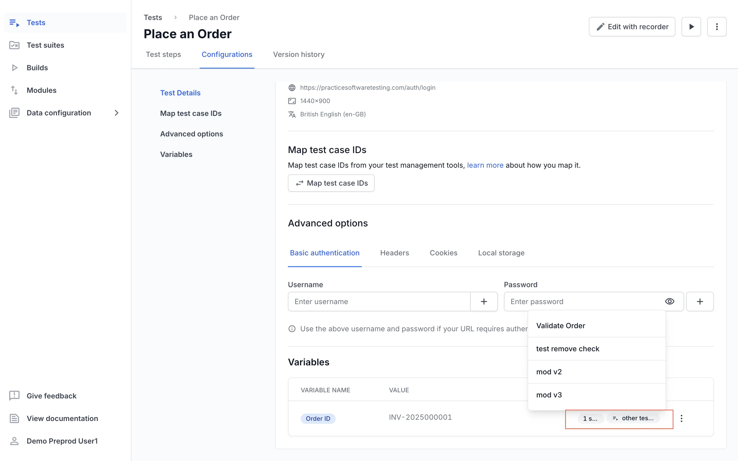 To run a cloud execution with shared data, ensure that Test 1 and Test 2 are in the same test suite. Since Test 1 and Test 2 share data, it’s important to run them in the correct sequence, as the order impacts how and when the data is passed in the cloud run. For more information, see the Reorder tests in a suite section.