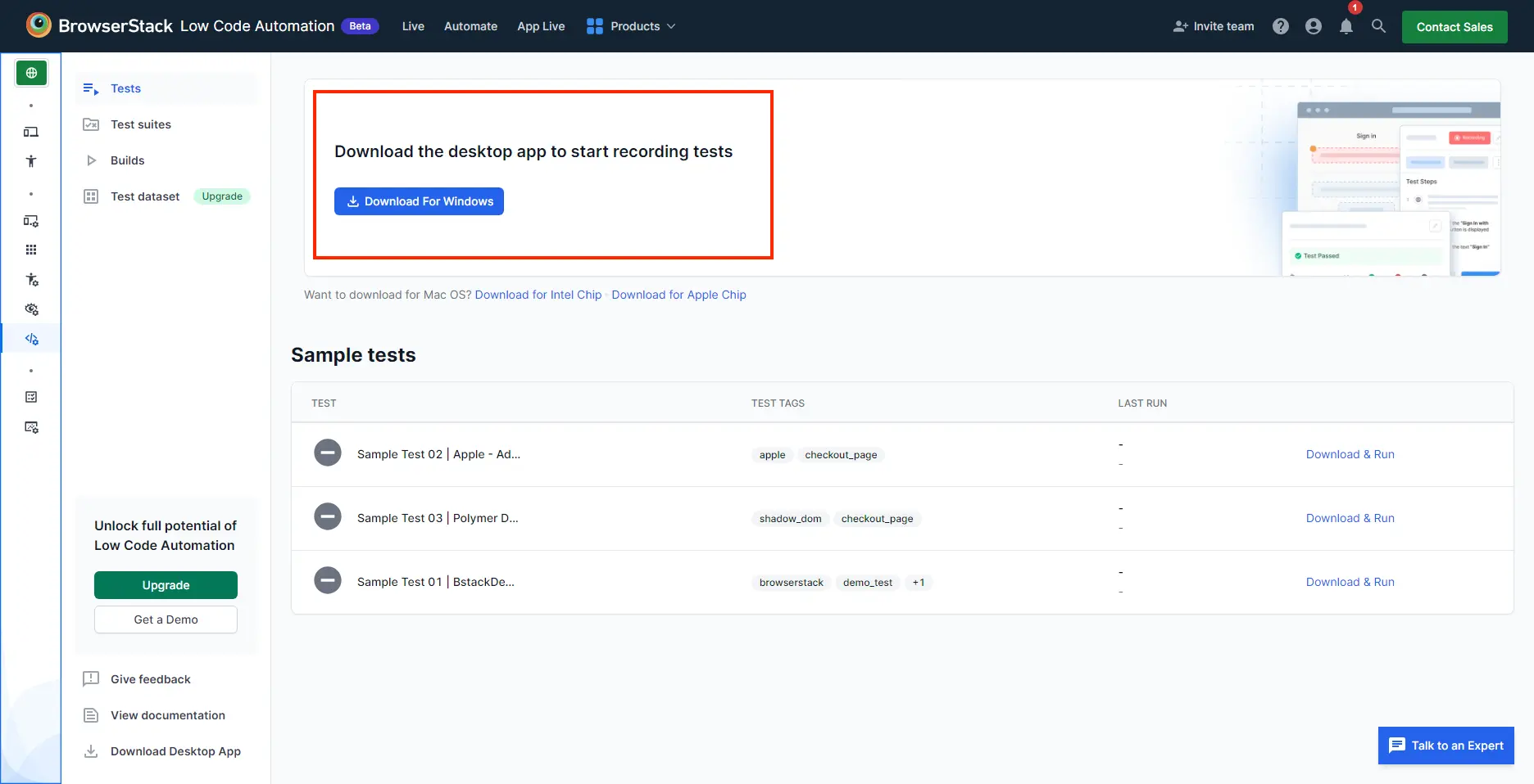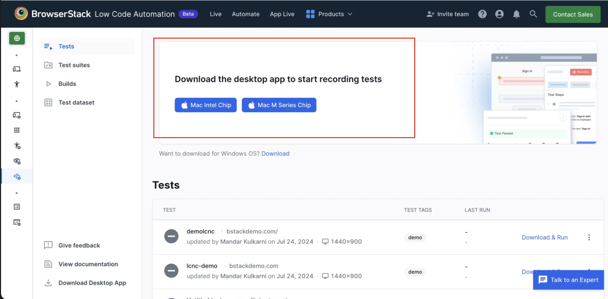 Low Code Automation offers both a web-based application and a desktop application. The web application allows you to view tests, manage test suites, trigger test suites, and view the build reports. The desktop application helps you to create the tests and execute them on a local browser.
