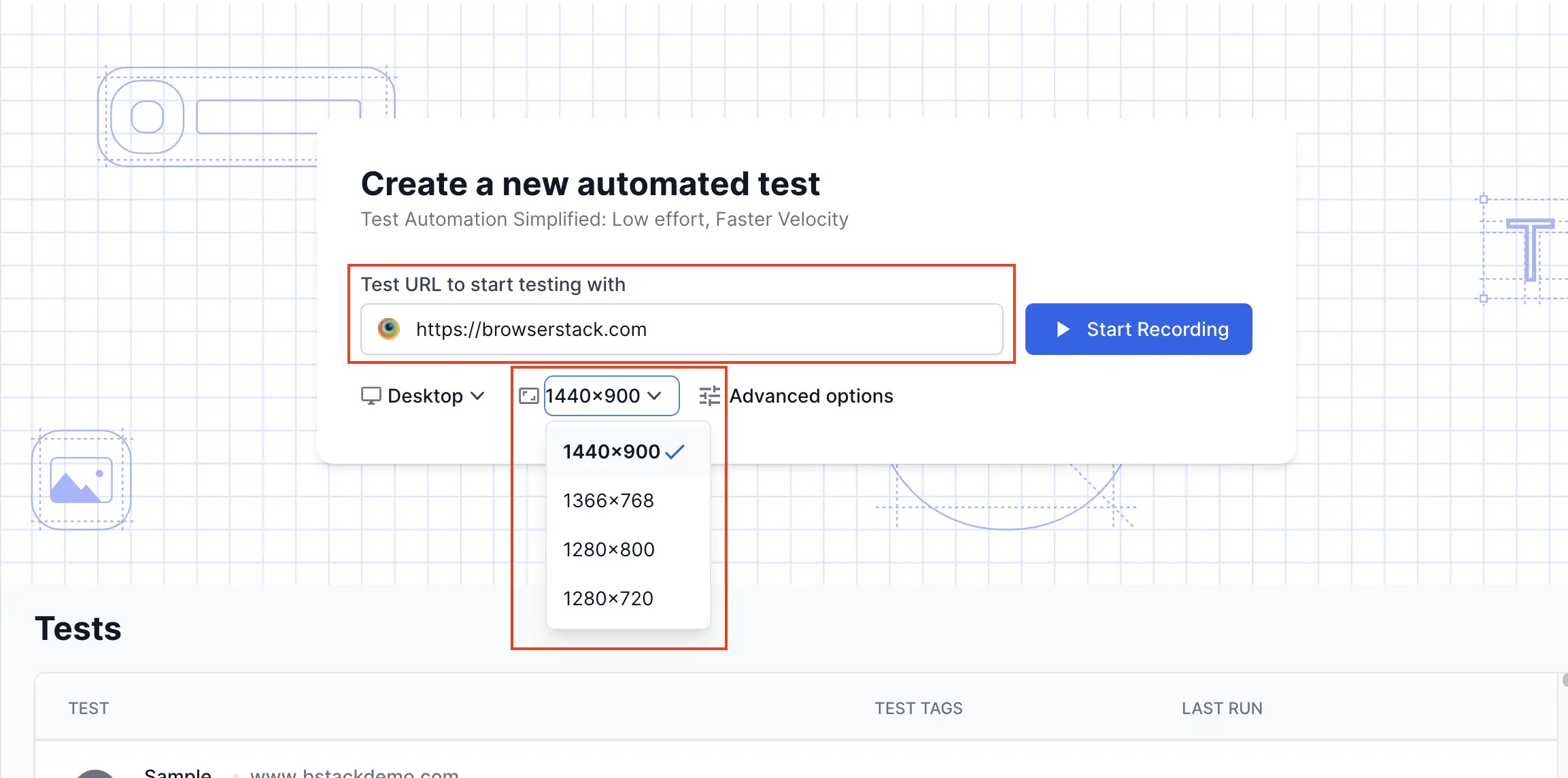 Once you launch the Low Code Automation application, enter the application URL under test, select the appropriate resolution for desktop and mobile, and click Start Recording. A new Chrome session will be launched along with a recorder panel.