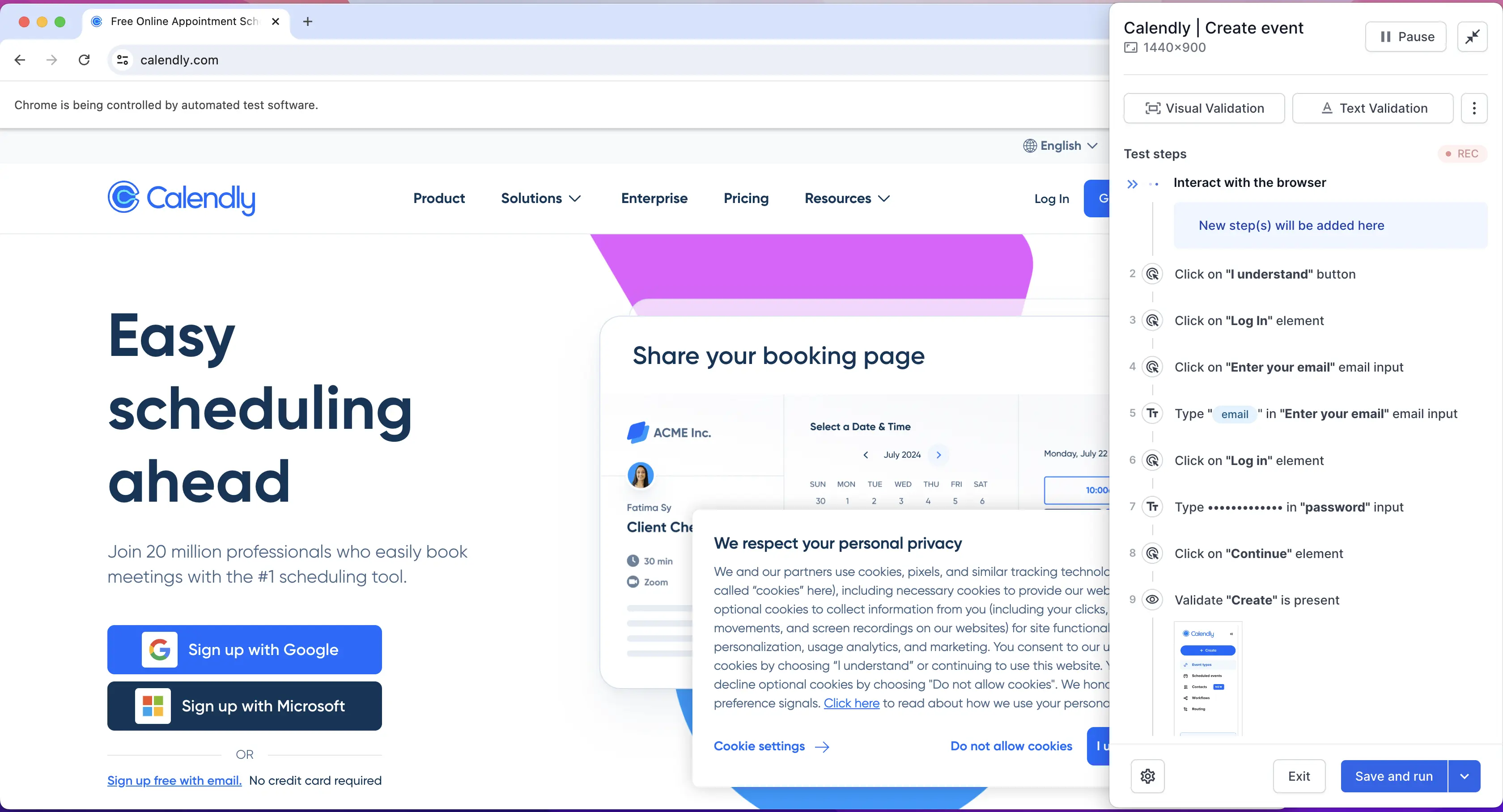 - When you start recording, a Chrome browser launches along with a recorder panel. Each test recording initiates a fresh browser instance to ensure that your ongoing test recording remains unaffected by cookies, cached data, or user sessions from your regular browser use.