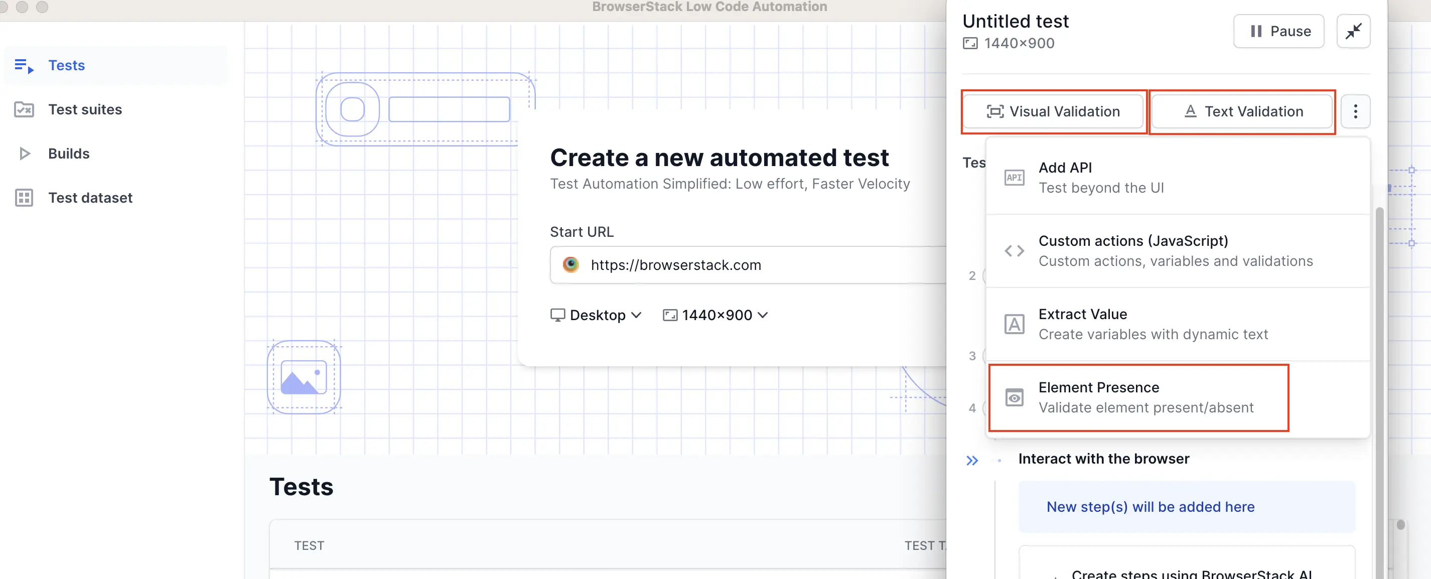 - Element presence validation: Select the element you want to validate. This validates whether the element is present on the UI or not.