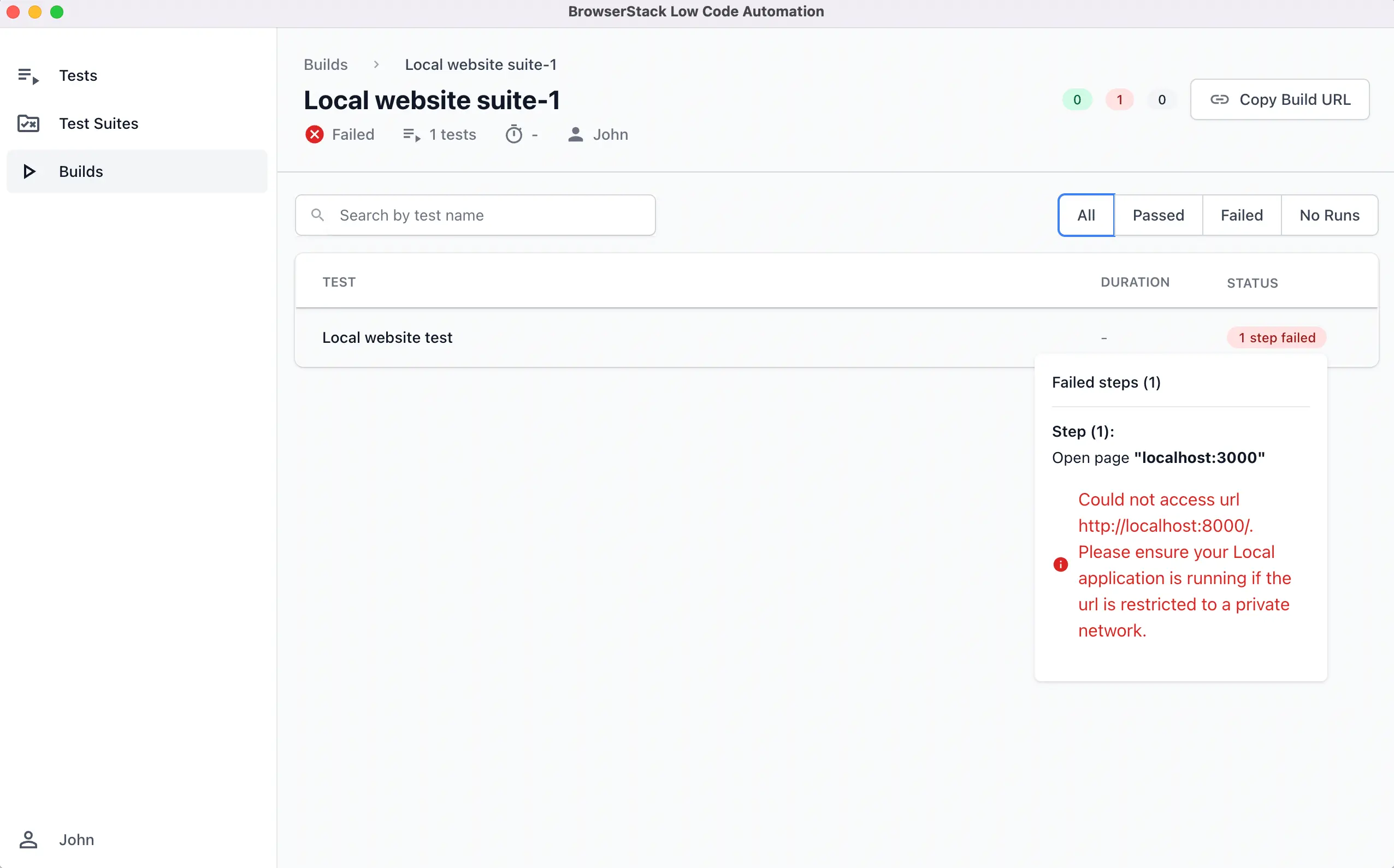 If you have triggered a Test suite and have faced the below issue while accessing the build run, it’s likely because you do not have Local setup running.