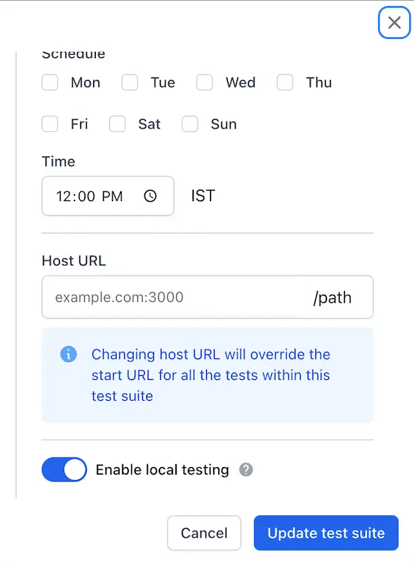 - After enabling the feature and whitelisting the IPs, activate the local setting for the test suites. Refer to Step 1 in the How to Configure and Set Up Local Testing? section.