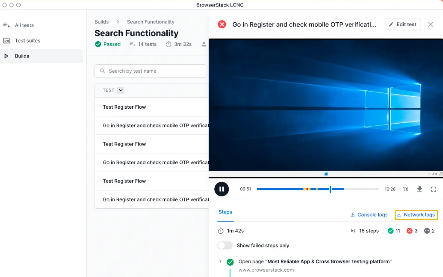 You can get a comprehensive log of all network activity during your Low Code Automation tests using the Network Logs feature. Network Logs capture the browser’s performance data such as network traffic, latency, HTTP requests and responses in the HAR (HTTP Archive) format. You can leverage Network logs to get a clear picture of all the requests your web page is making, and the time taken for each of these requests. You can download network logs from the test present in the Builds section on the Low Code Automation dashboard.