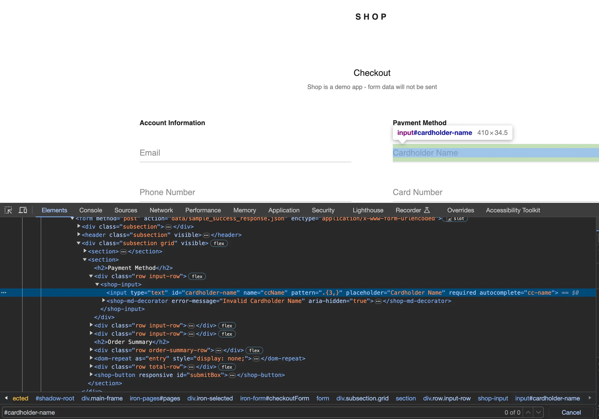 In this example, we want to target an input element with id cardholder-name which is inside a shadow-root having parent element with id cart-checkout.